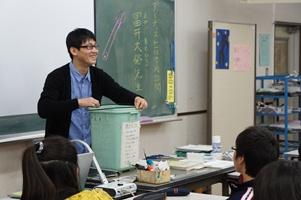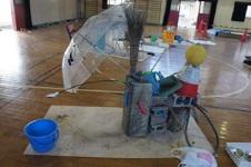 檀上でゴミ箱などを使っての実演が始まりました。(左)