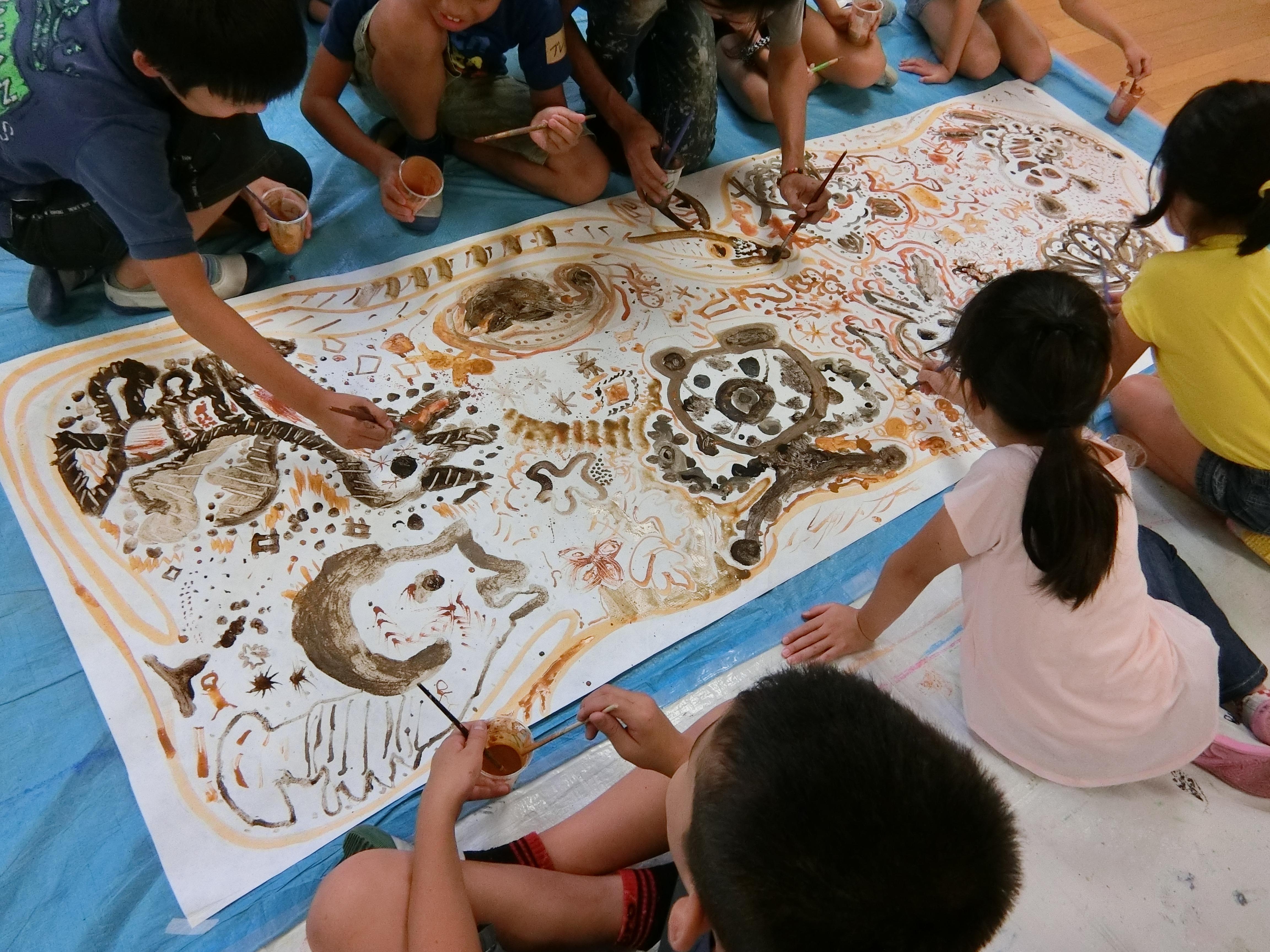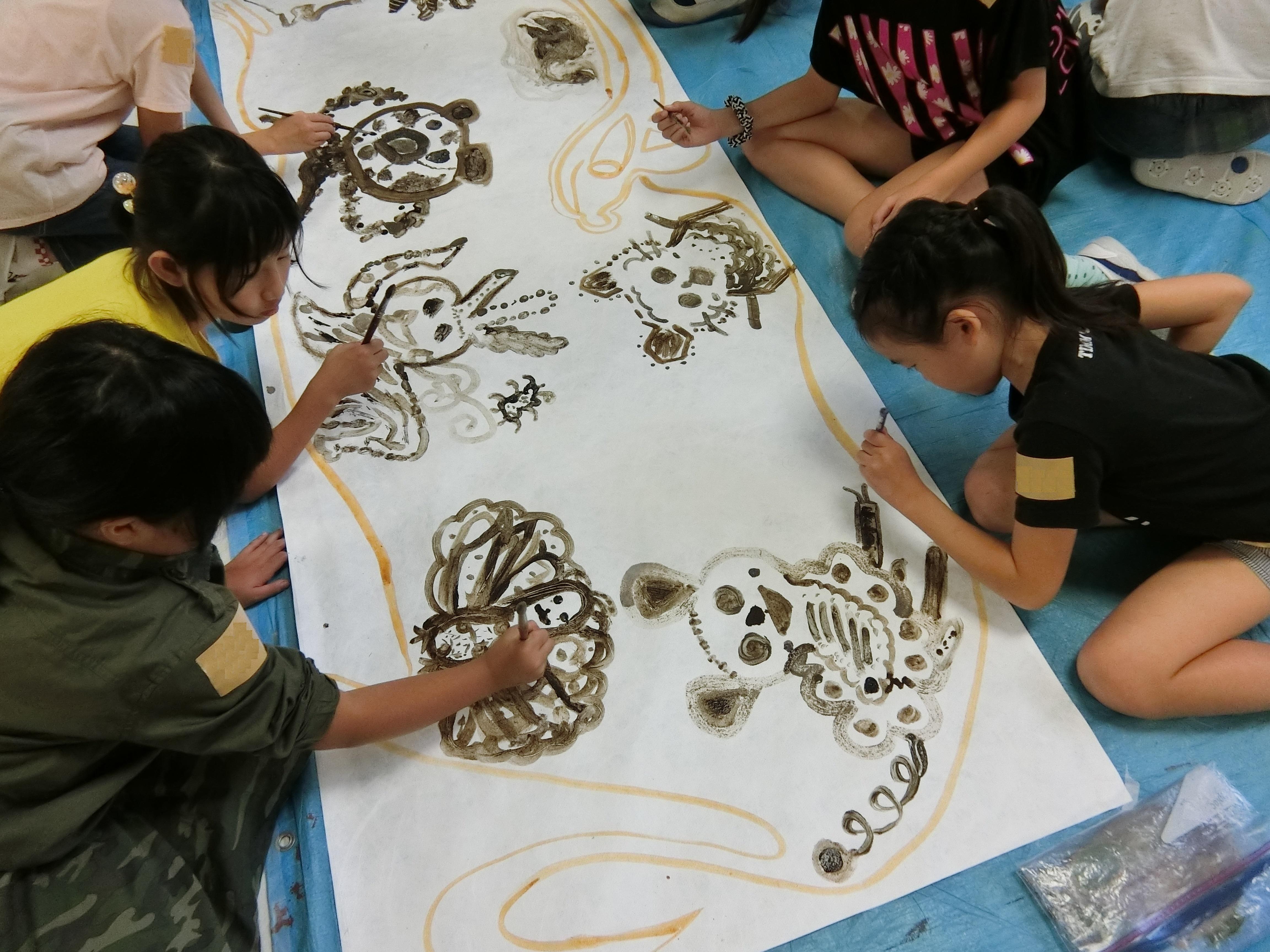 こどもたちは、自分の生き物の中を、濃い色の土で塗ります。