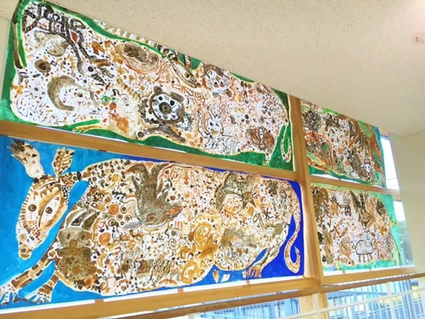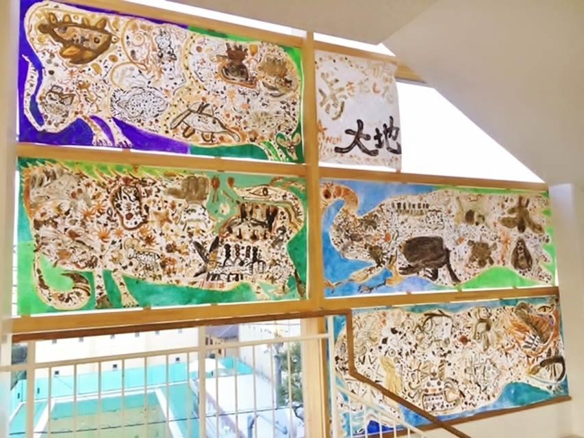 学校創立90周年を機に、校内の吹き抜け階段の窓に、泥絵を飾ることにしました。