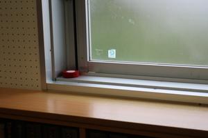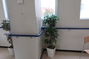 また、渡り廊下には、青い手すりの上に、色みが近いカラーテープの