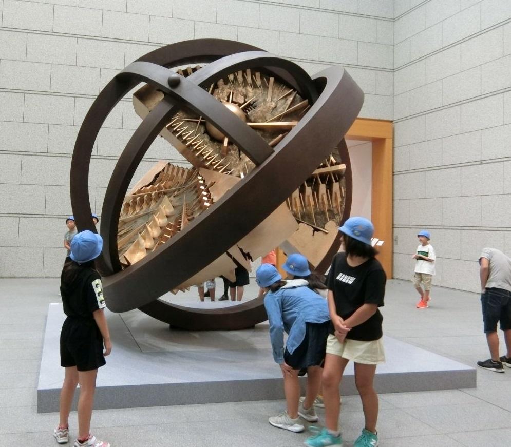 写真(上)は、アルナルド・ポモドーロの作品《太陽のジャイロスコープ》を鑑賞している様子です。まずは、直径約4メートルある大型の彫刻作品に近づいたり離れたり下から覗いたりしながら、色々な視点からみました。