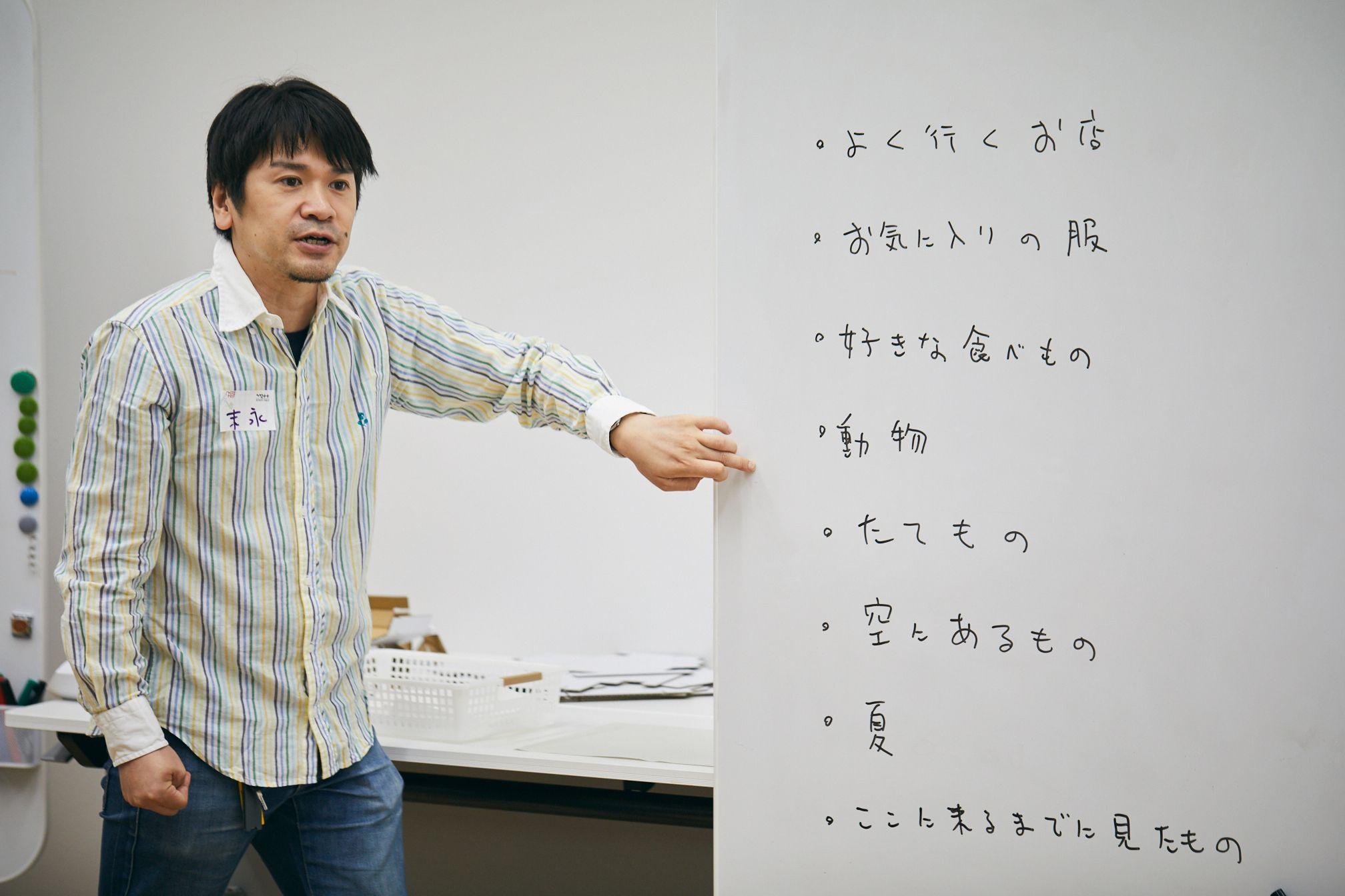末永さんからいくつか描くためのテーマが示されました。「好きな食べ物」「動物」「空にあるもの」「夏」「ここに来るまでに見たもの」など、全部で8つの中から、それぞれ好きなテーマを選びます。