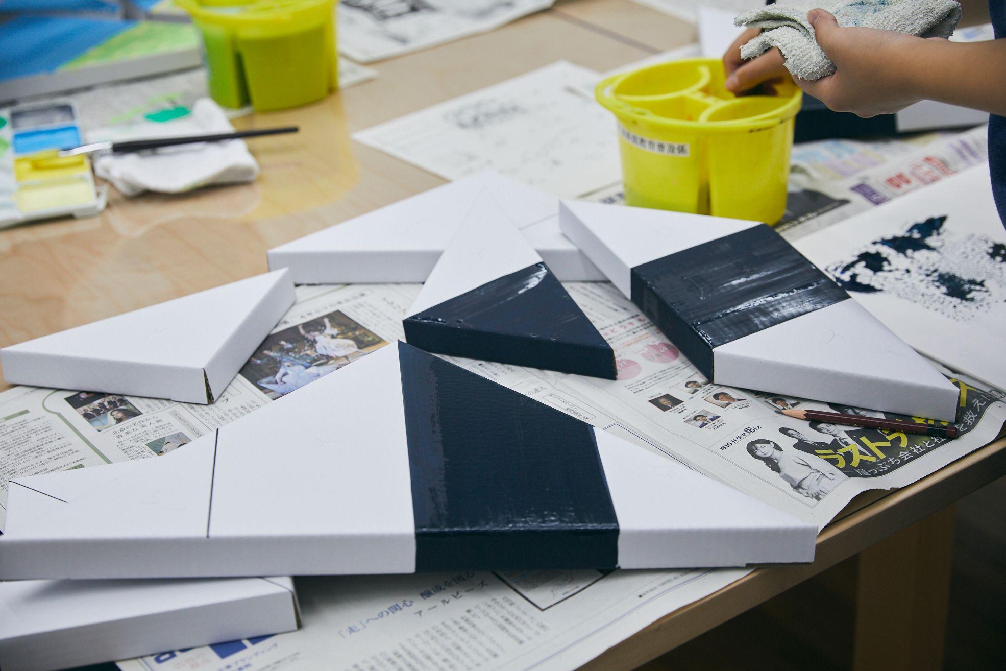 ワークショップ2日目、9月22日(日)に実施した、ワークショップB「ダンボールでつくるタングラム・ペインティングの制作と展示」には1日目とは異なる7名が参加しました。こちらのワークショップは、10:30~16:30とちょっと長丁場です。