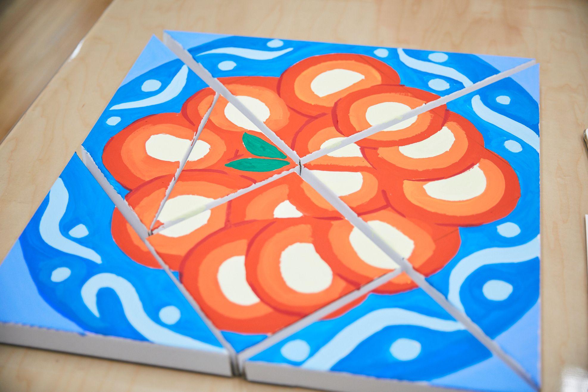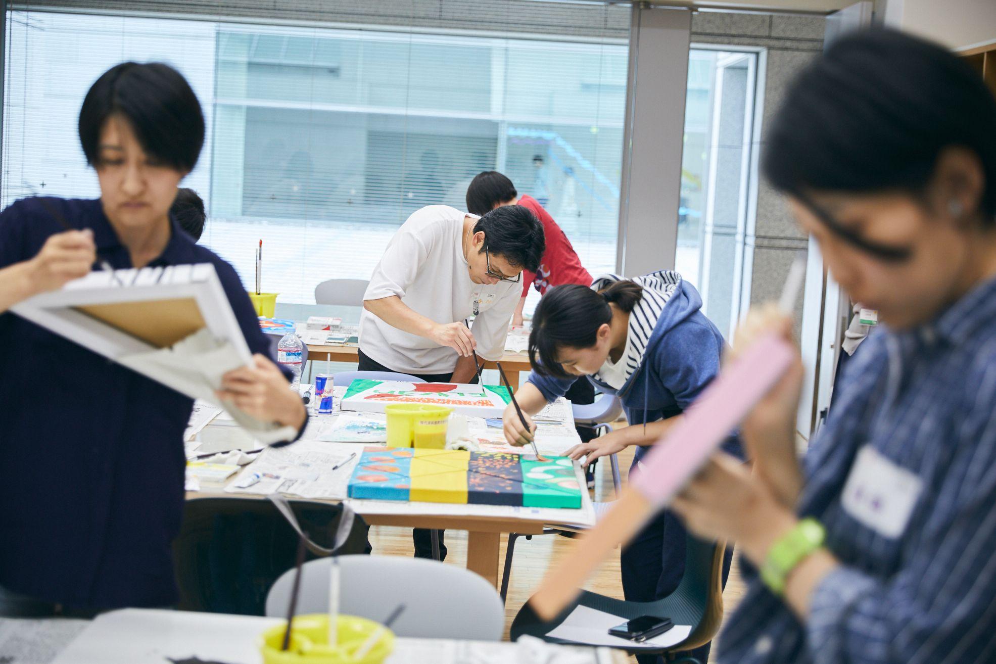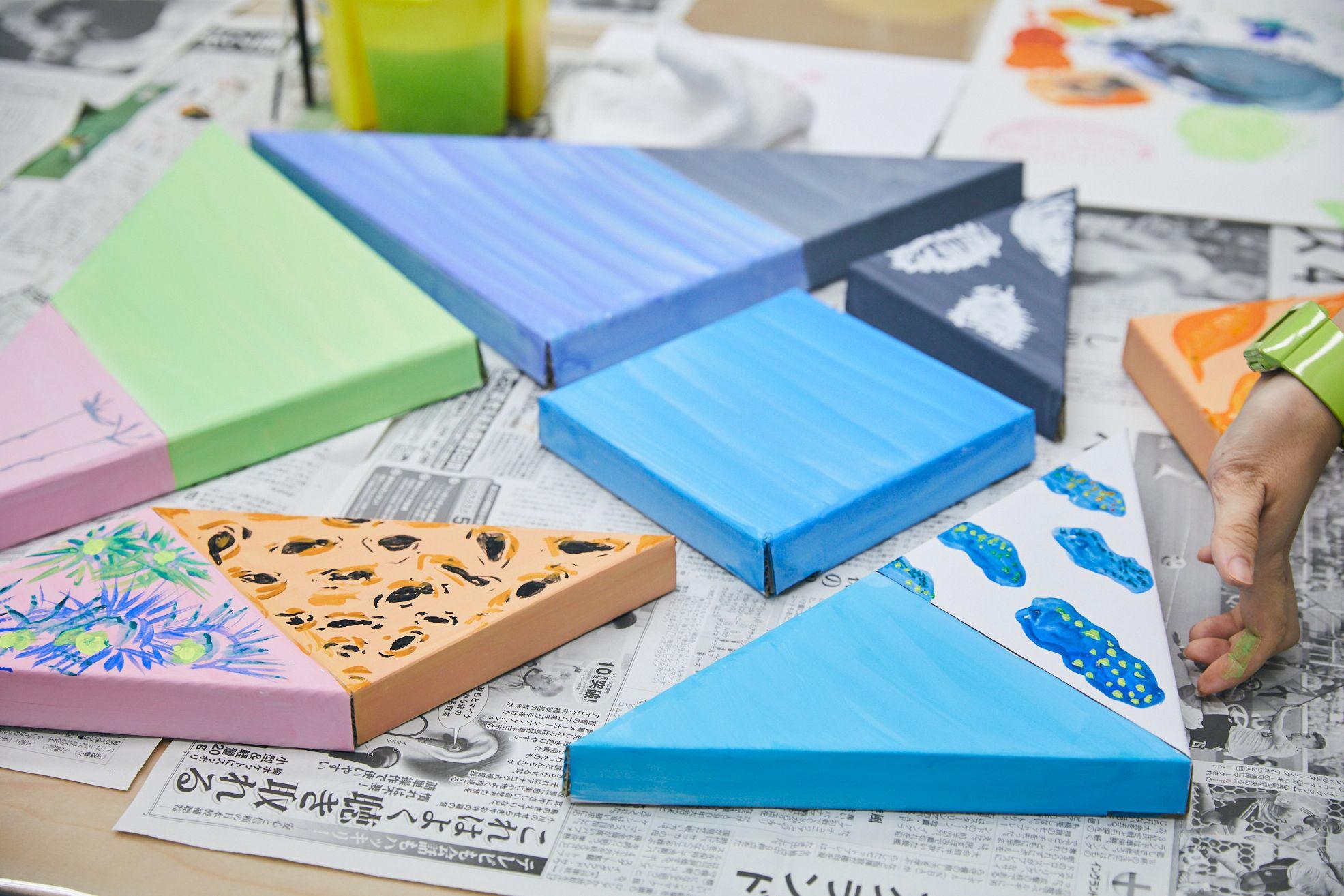 これらのテーマに従って、何か具体的なものを描いても良し、色面で塗り分けていっても良し。また、テーマとなった場所の特性から展開したり、あるいは色や形、パネルに引かれた黒い線をきっかけにして描いていくなど、それぞれに進め方を考えていきます。