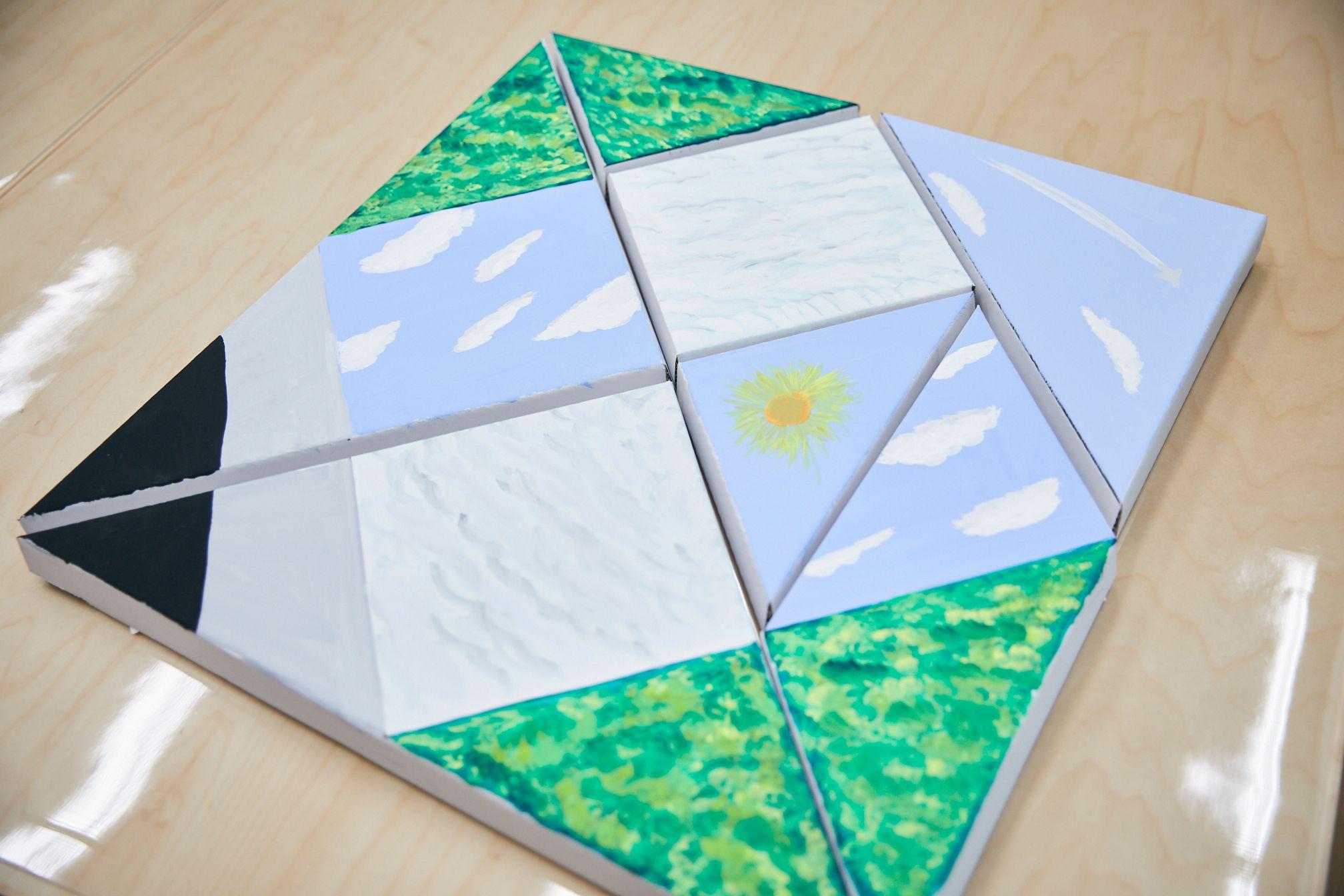 「空にあるもの」をテーマにして描かれた作品。タングラムのパーツがさらに分割して見えるように描き分けています。