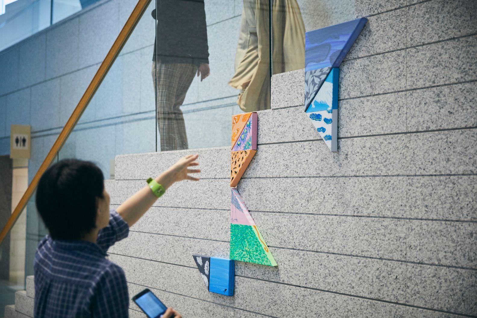 末永さんからは「この作品は、正面だけで完結せず、パネルの側面にも注目して描いていている。この場所に展示することで、階段を上り下りする人の姿も作品の見え方に影響してくるようで面白いですね」とのコメントがありました。