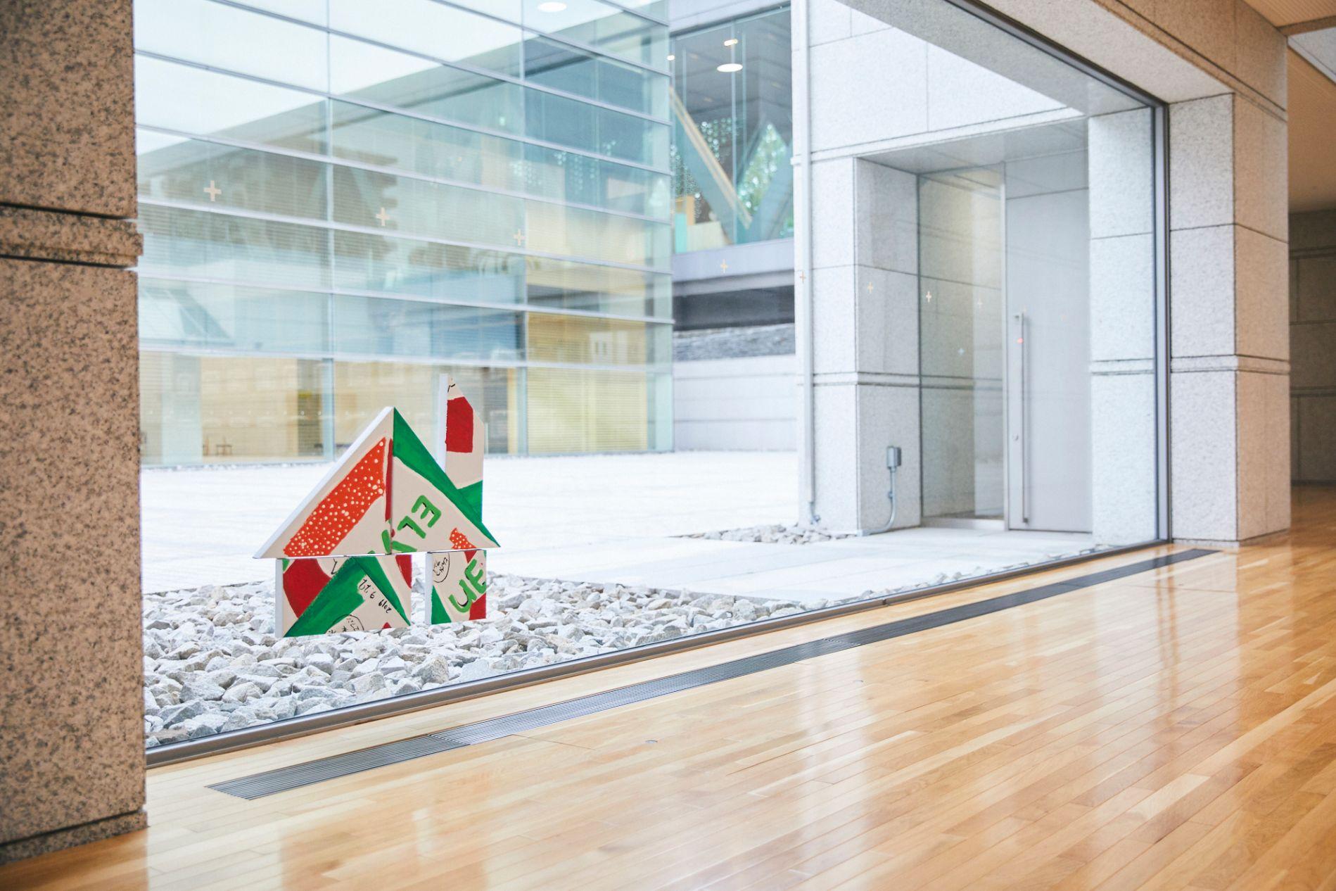 家の形に組み替えられた作品は、ガラスの外側に広がる砂利の床と呼応しています。