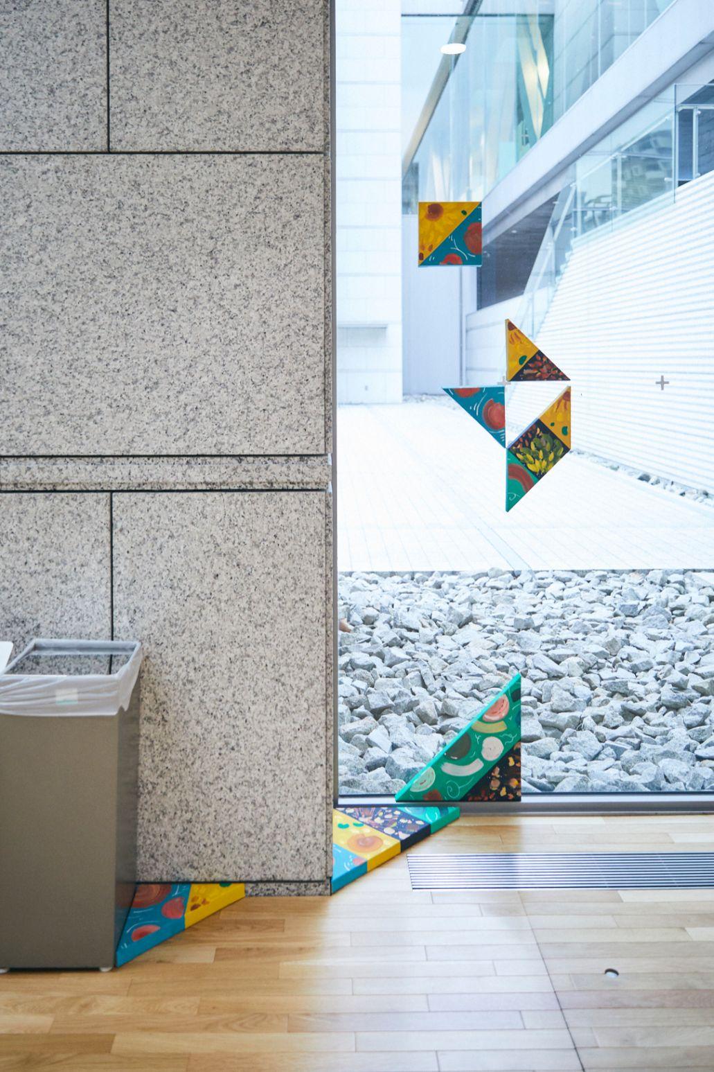 「動物」がテーマの作品。タングラムパズルのパーツ一つひとつに動物から展開された絵が描かれています。地下と地上とをつなぐ階段の壁面に展示することによって、上下関係による生態系を表したとのこと。