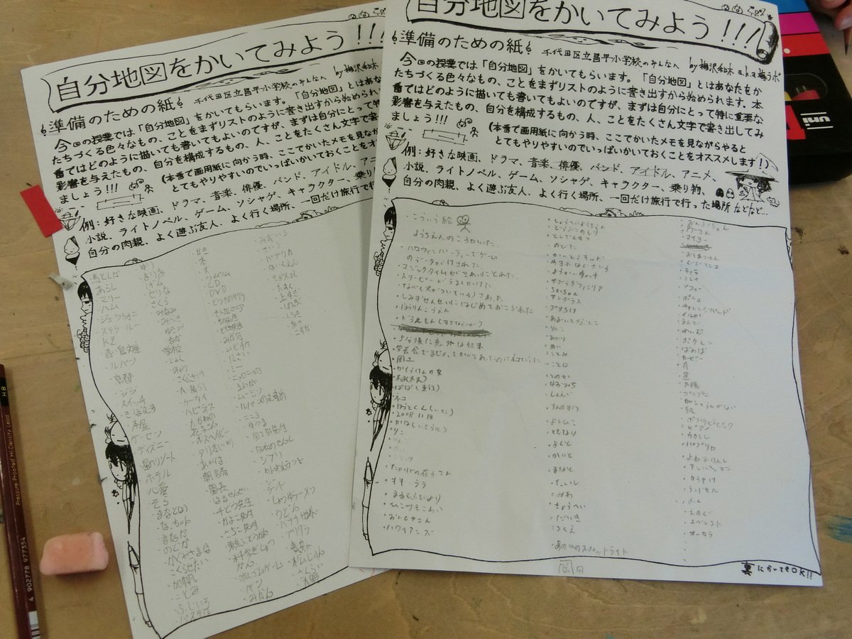 “自分自身を振り返る”という過程が重要となるため、すべての実施校に共通して、事前に梅沢さんによって用意された「自分地図」に取り組むための“準備のための紙”に自分が好きなものやことを記入しておいてもらいました。