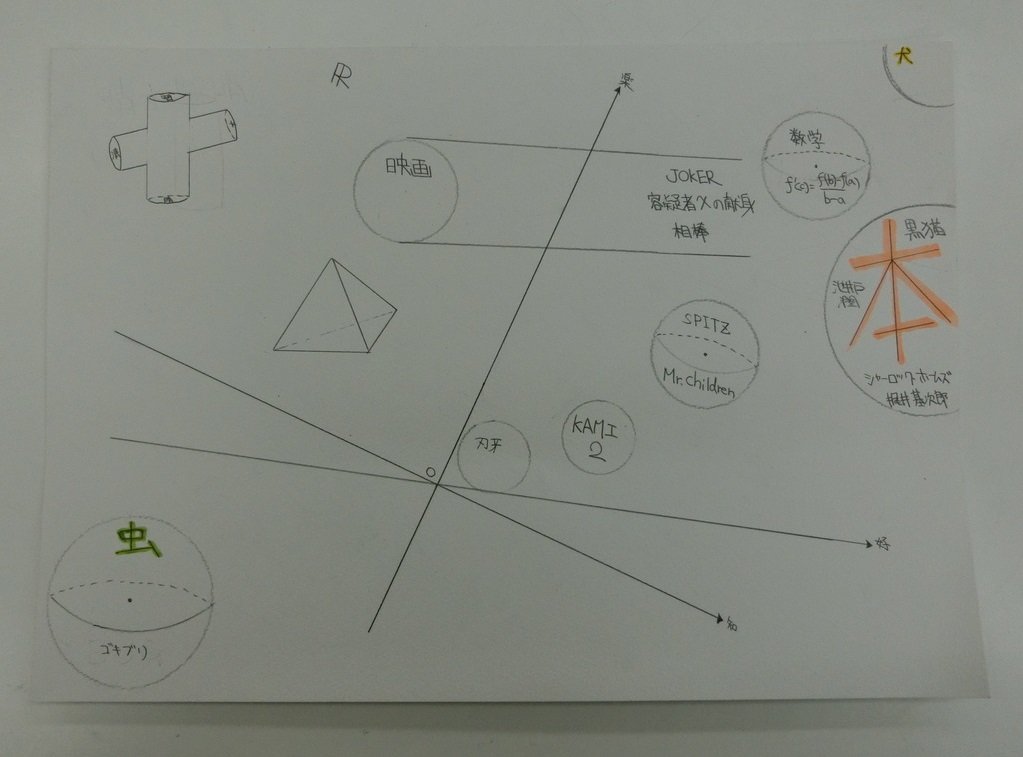 完成した作品の一例。好きなものと苦手なものを座標平面として表しています。幾何学的な形を活かして、関心のあることの表現の仕方にも工夫を加えています。