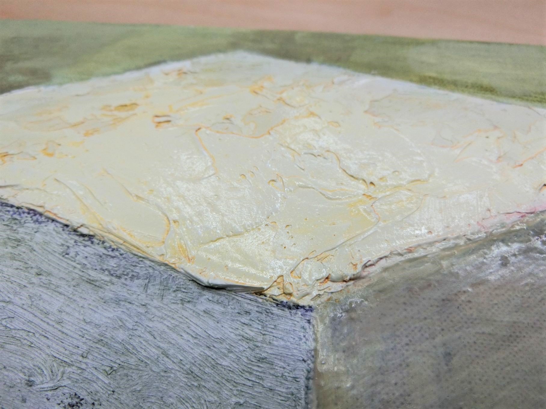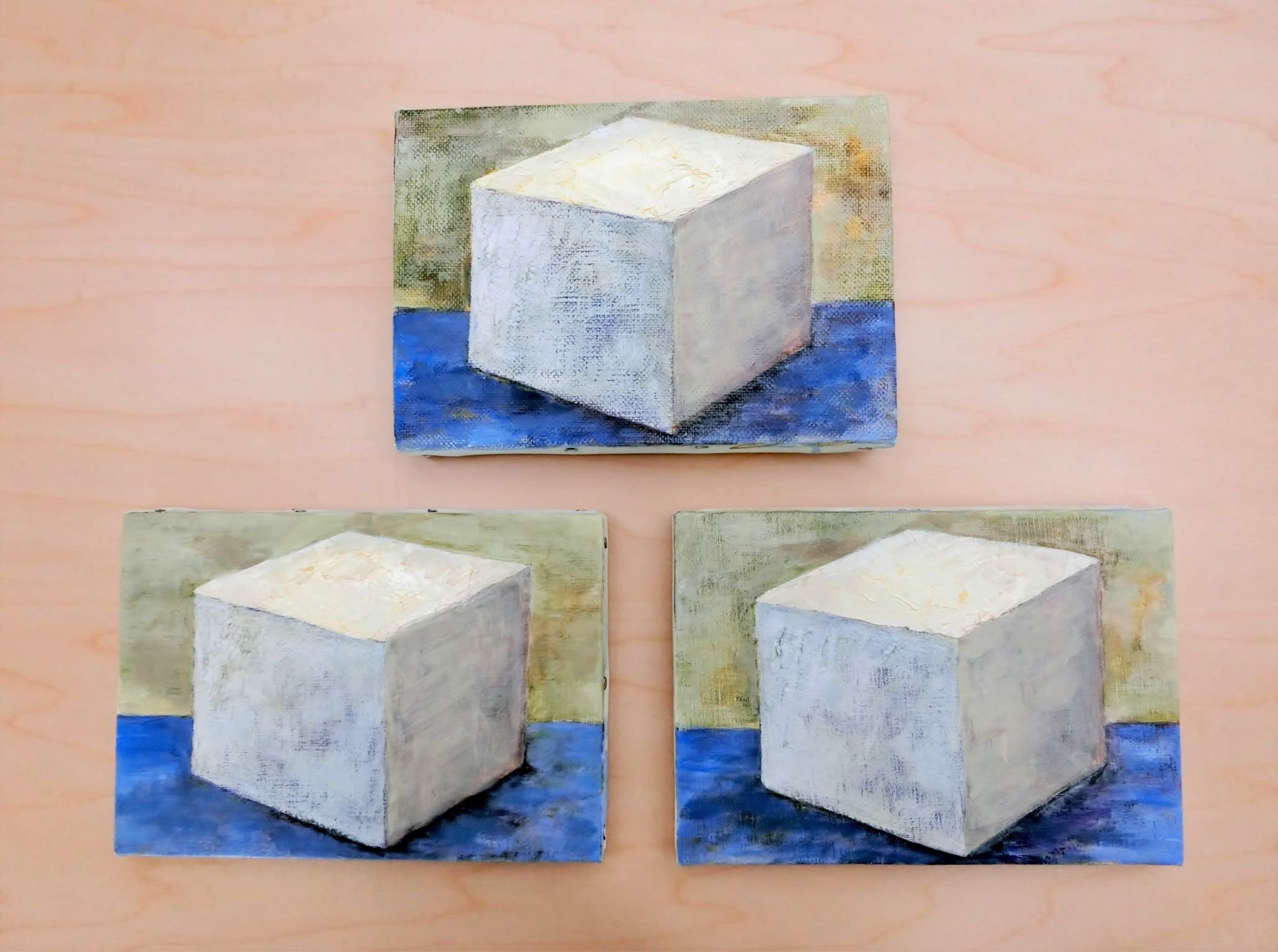 立方体の面ごとに、筆描き、ナイフ描き、グレージング(溶き油でゆるくした絵具を何層にも重ねる描き方)で描画しており、キャンバスの目の粗さによっても画面のニュアンスは違ってきます。