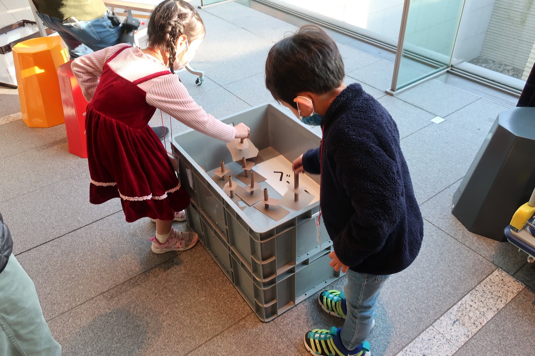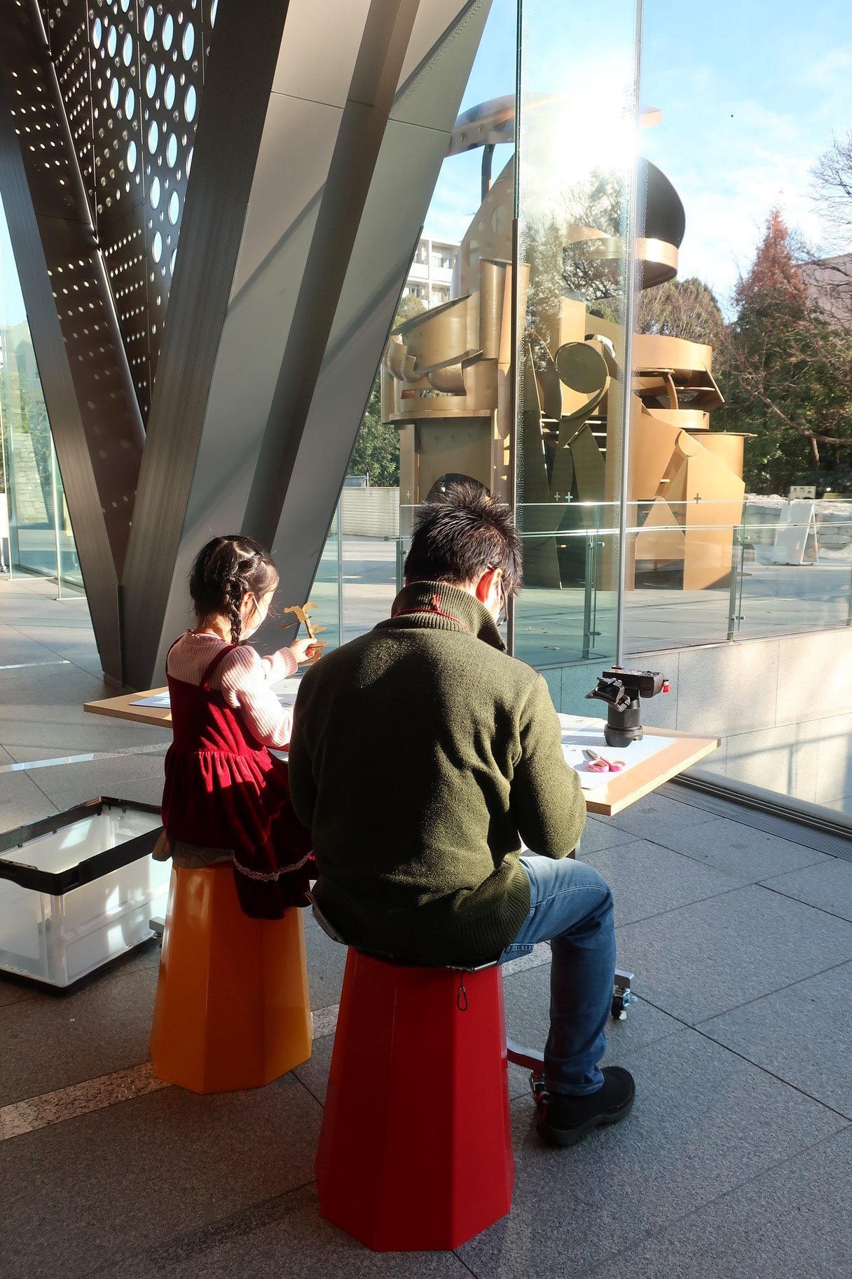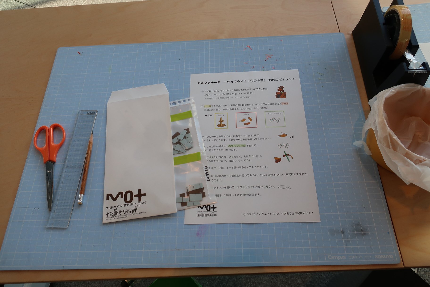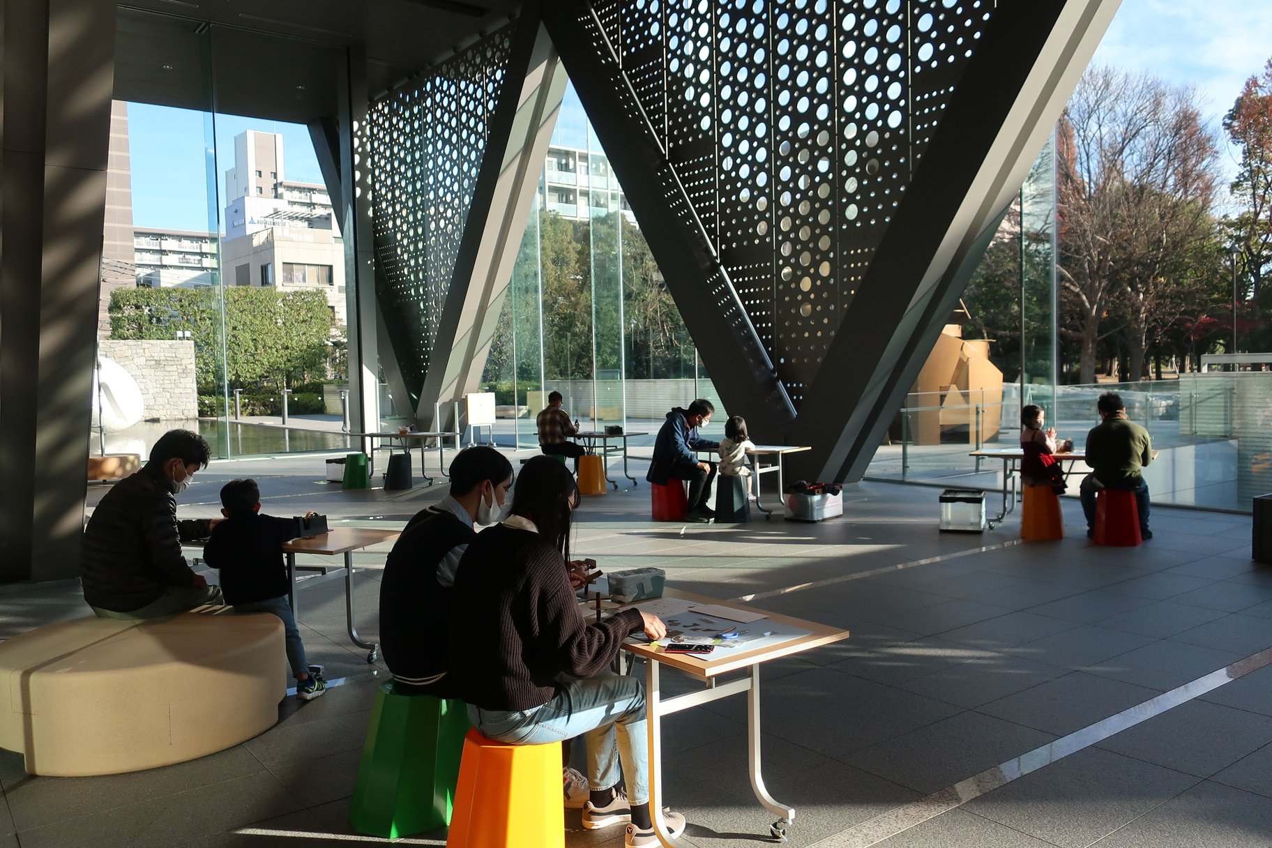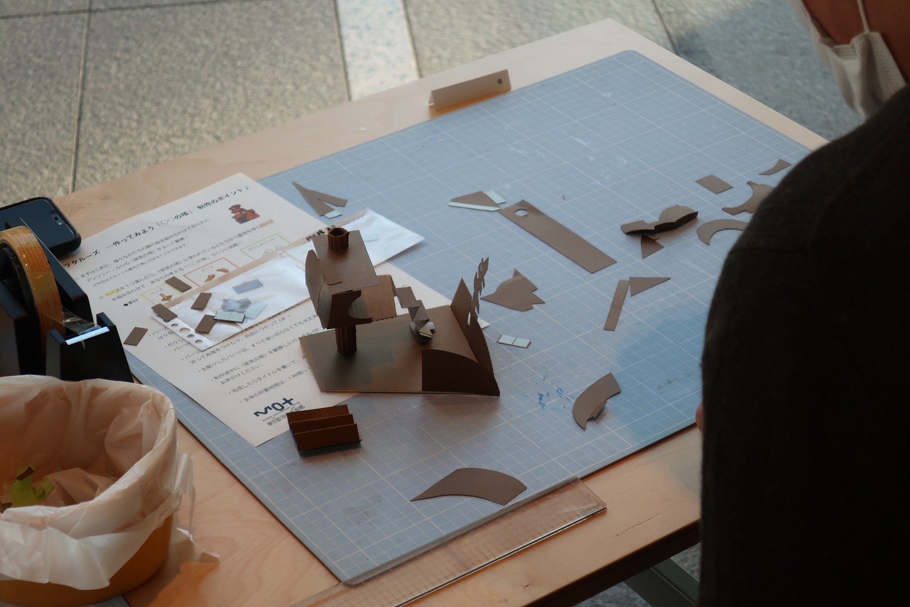 実施場所は《発見の塔》が良く見える当館エントランス。コレクション展示室前に、参加者ごとのパーソナルスペースを確保した作業机を用意し、当日自由に参加できるオープンワークショップ形式で実施しました。