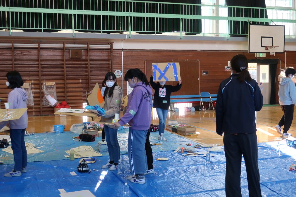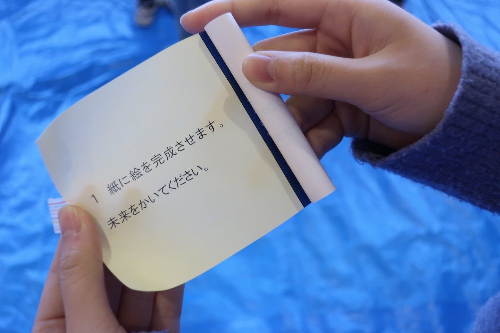 立体作品を作る、紙に絵を描く、ダンボールに絵を描く、のどれかが書かれている最初のミッション。そこにはさらに未来や風景、思い出などといったテーマも書かれており、人それぞれ異なります。この最初に引き当てたミッションは最後まで継続していきます。