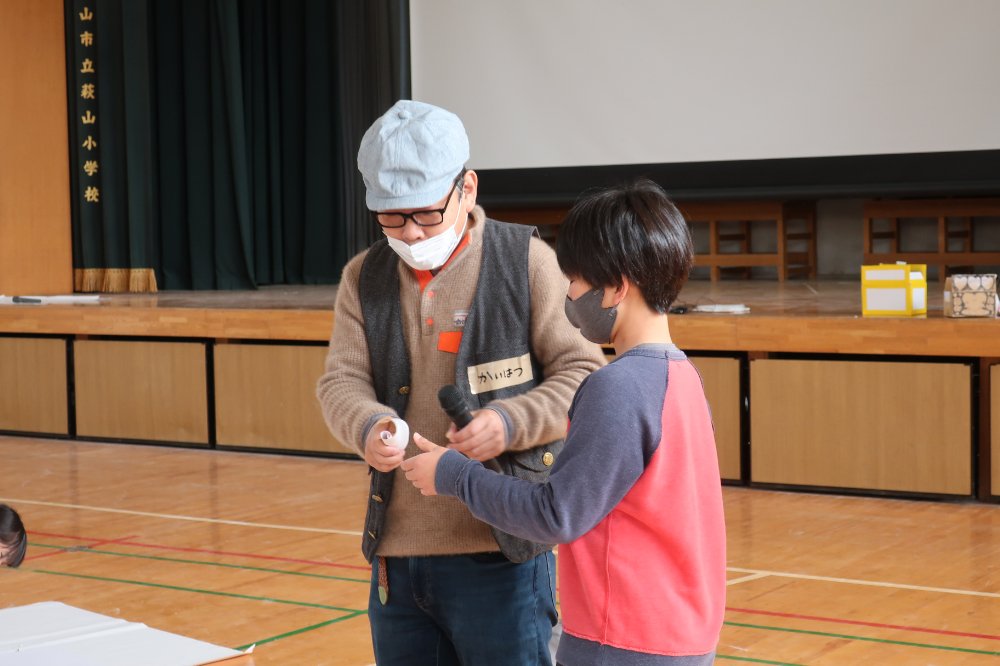 卒業を間近に控えた6年生が対象となった葛飾小。中には、一昨年、当館で開催した「あそびのじかん」展で、開発さんが手掛けた作品を見てくれた子もいました。