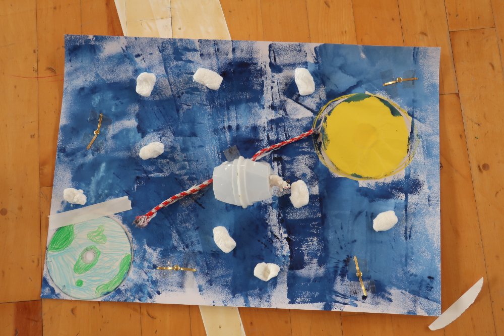こちらの作品は「未来エレベーター」を想像して描いたそうです。地球と月とをつなぐエレベーターには、ネコが乗っています。