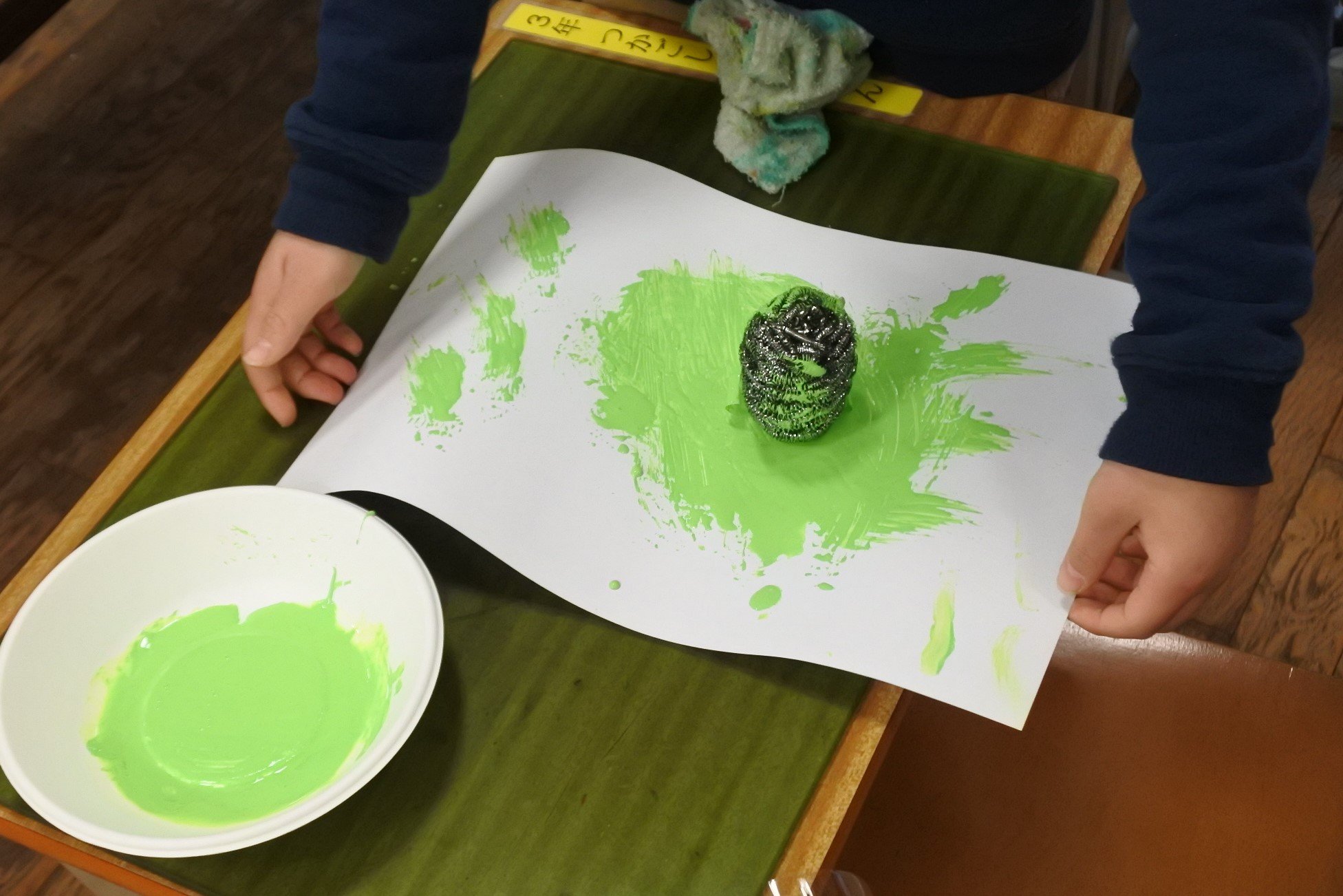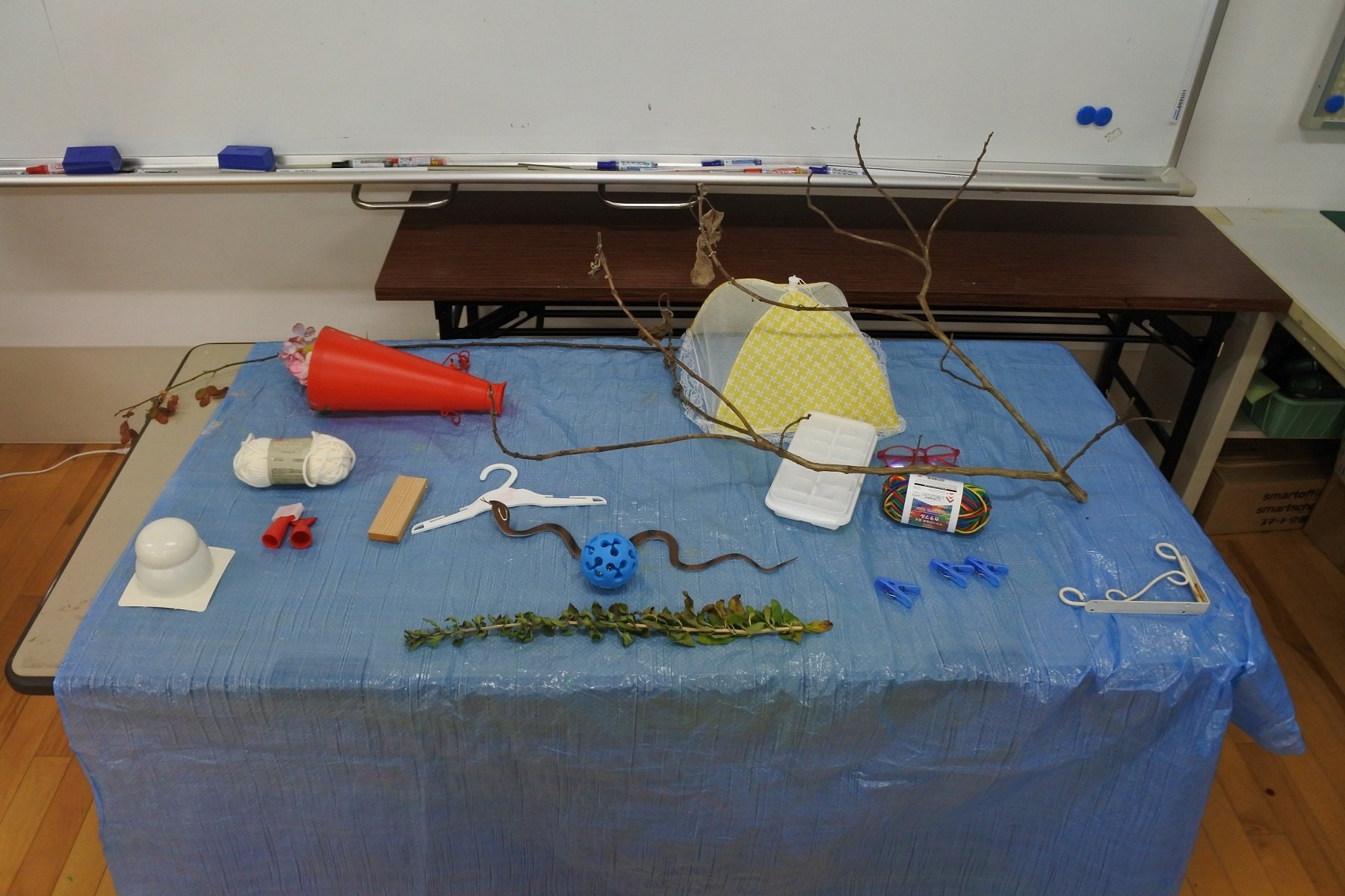 「木の枝や、大きめの物など、集めた道具の種類が豊富で良かった。」などのコメントを先生よりいただきました。
