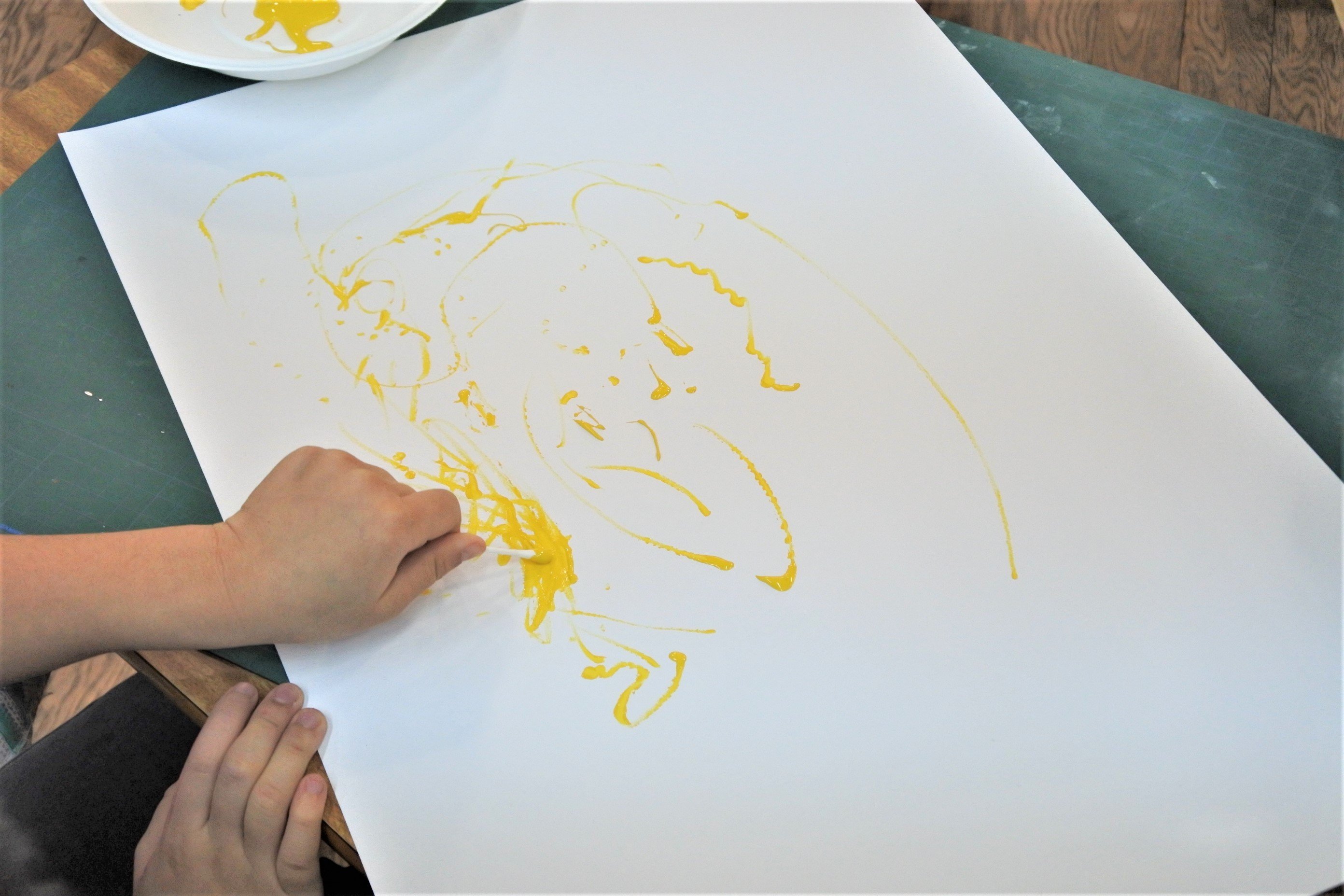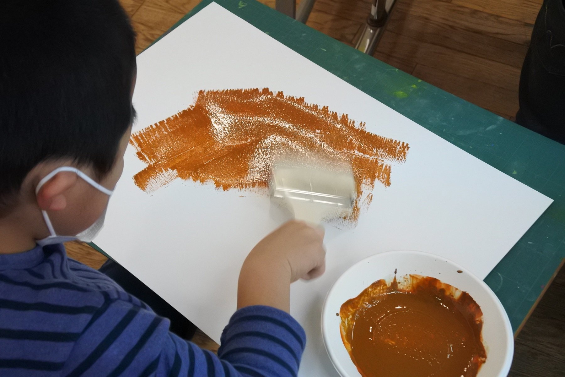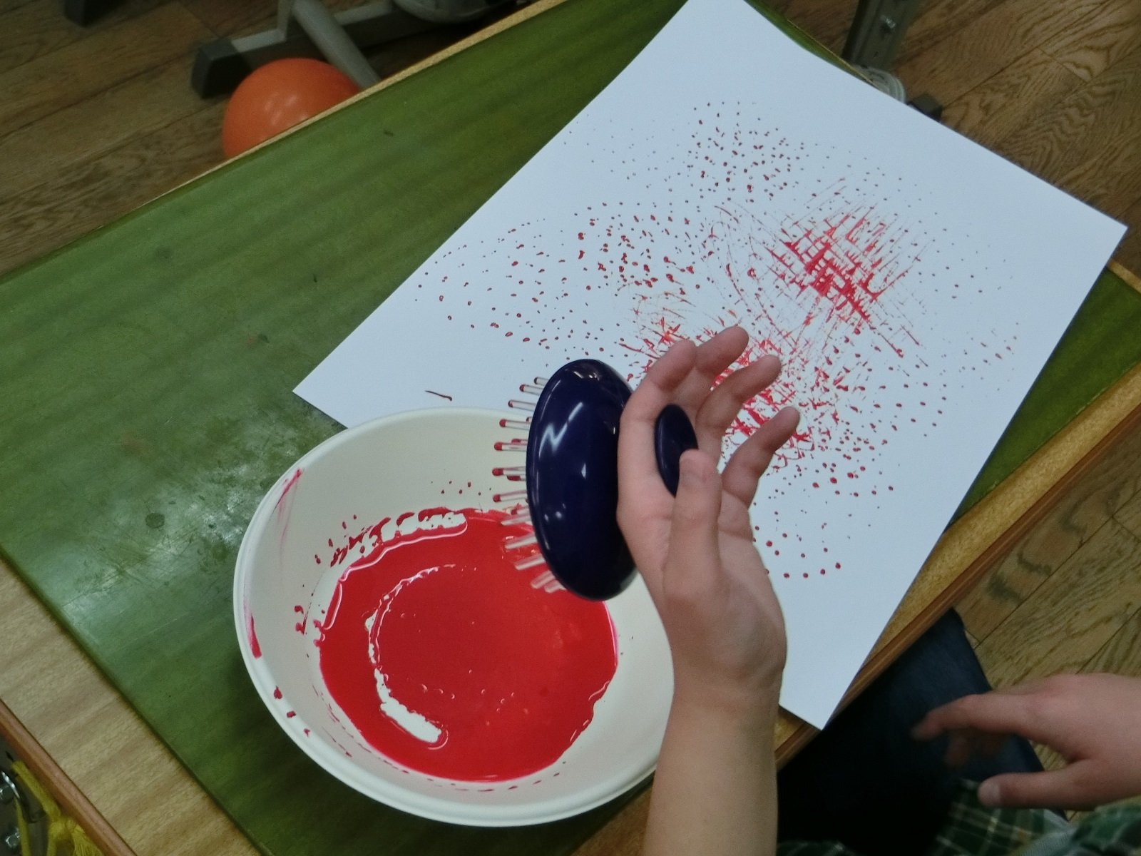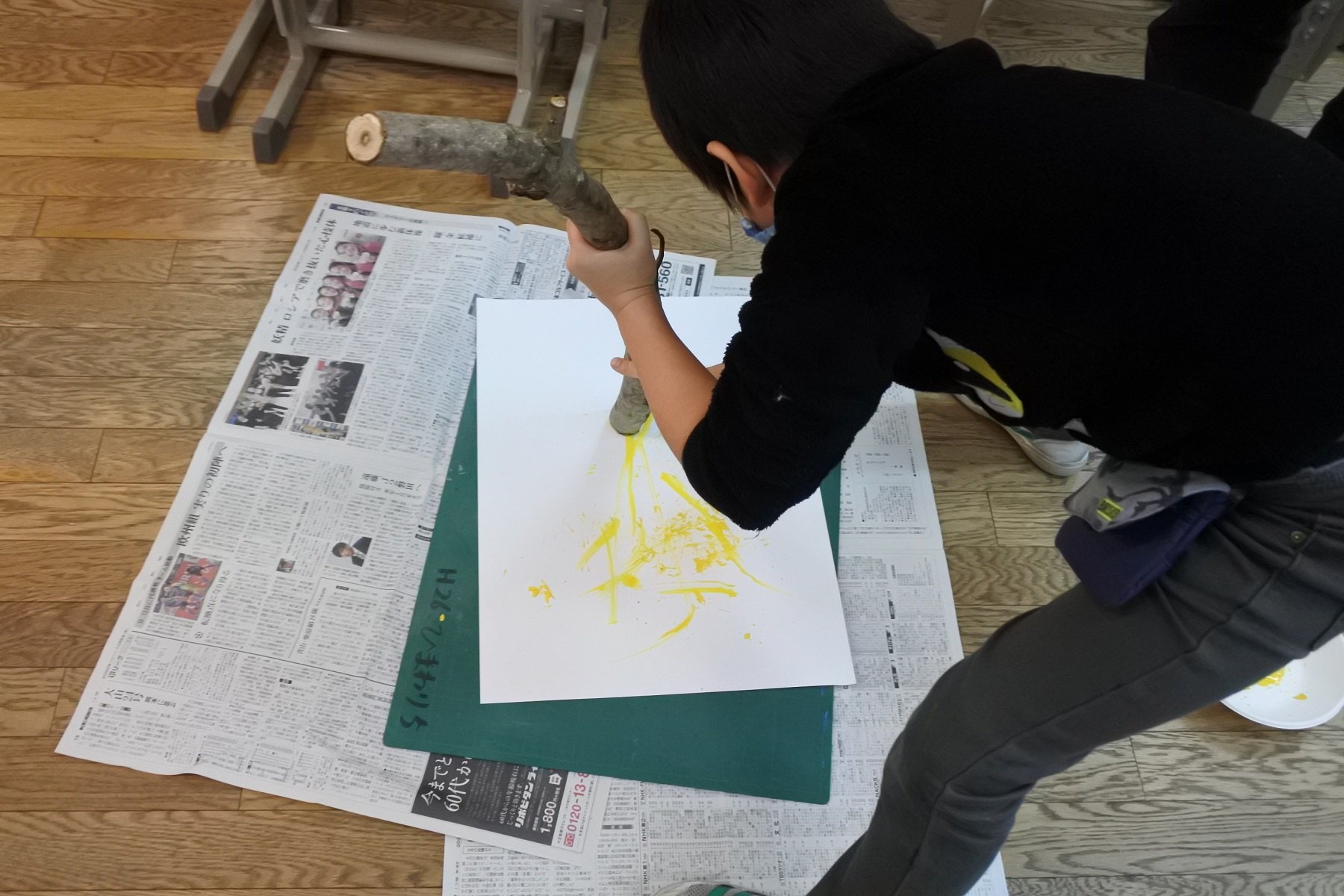 当日は様々な道具が用意されており、児童たちは授業前から興味津々。授業内容の説明が終わると、方々に品定めを始めていました。気になる道具を見つけたら、好きな色の絵の具を付けて勢いよく描きはじめます。