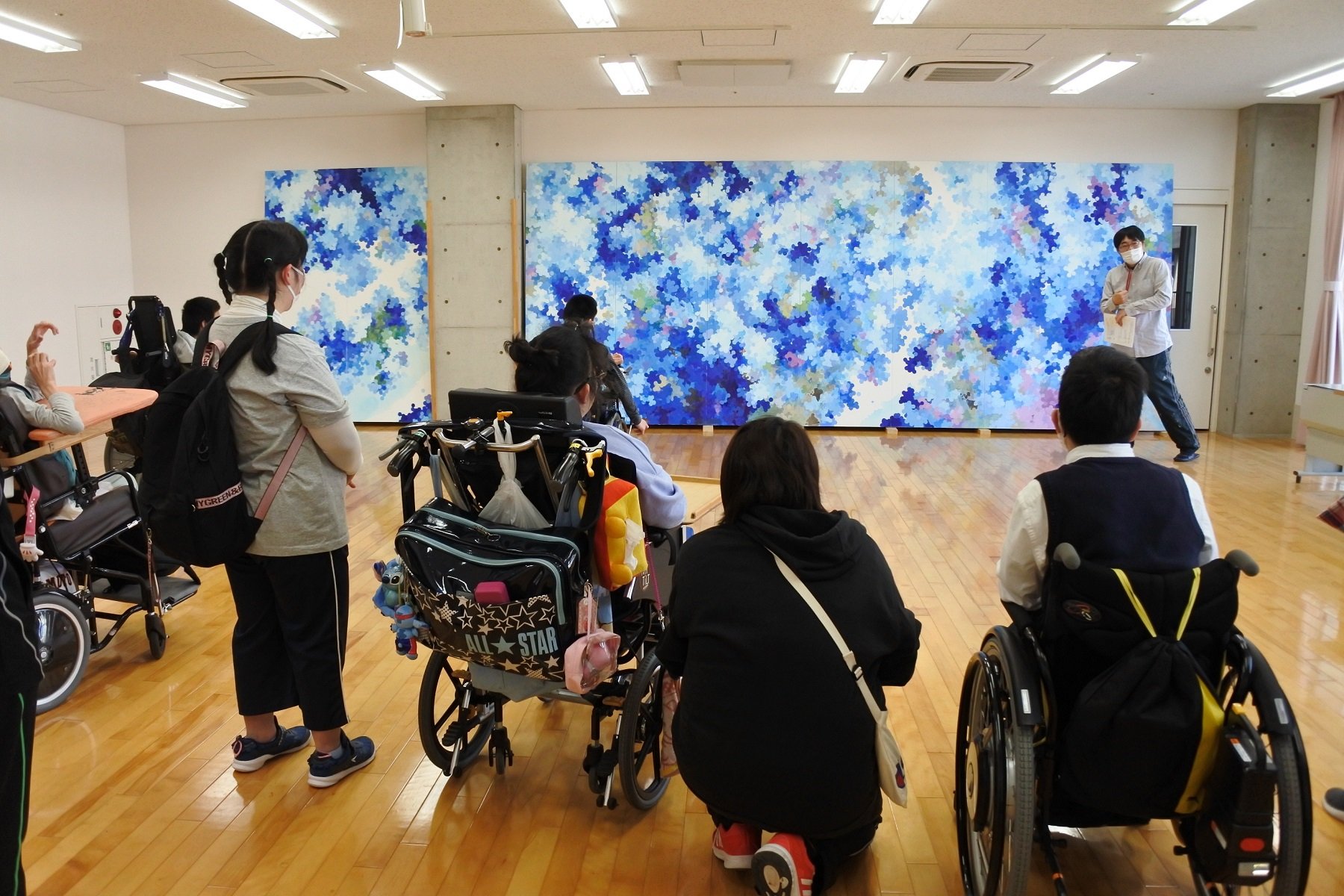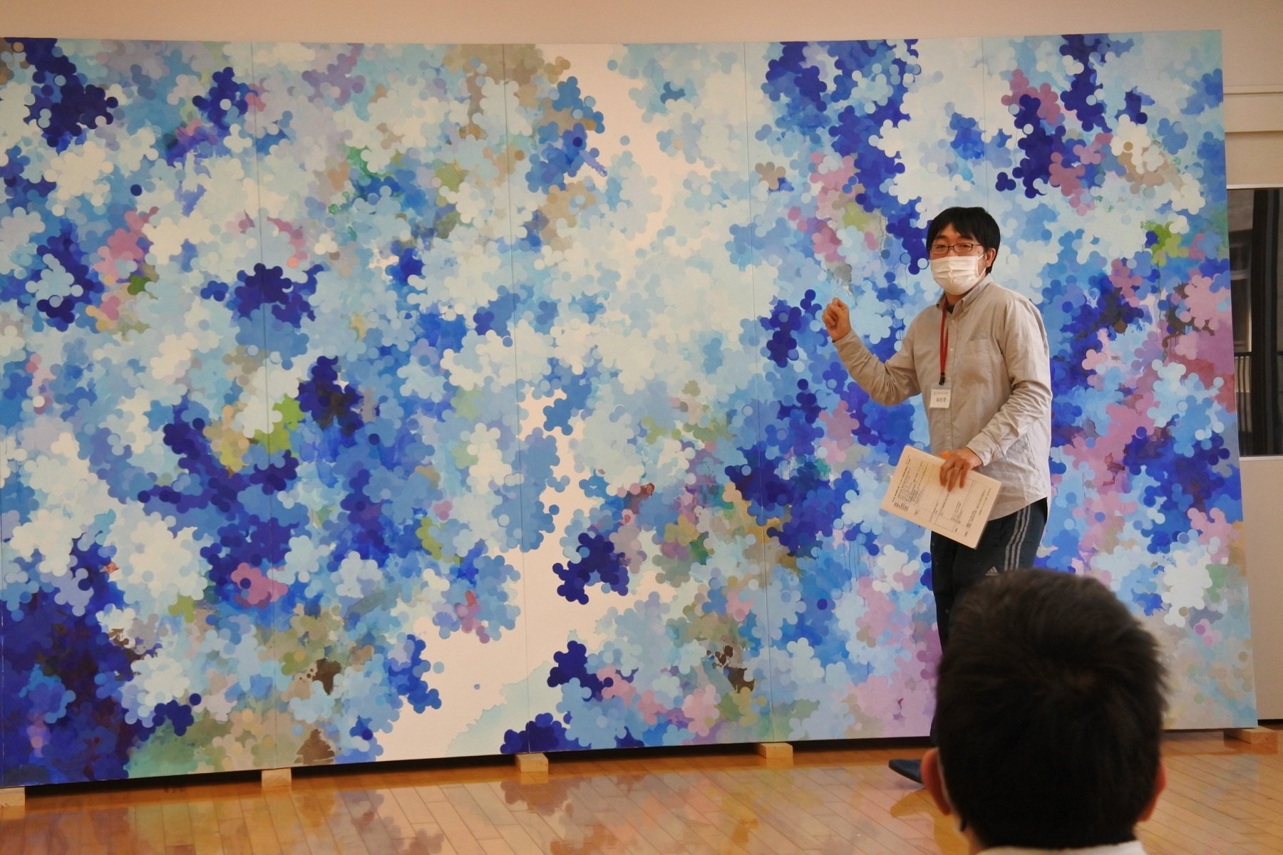 その後には、恒例の内海さんの作品鑑賞も。この回には、2020年11月に発表したばかりの新作を鑑賞することができました。青が印象的な大作です。日頃、自分たちが生活している学校の一室が内海さんの作品で彩られているとあって、教室に入った瞬間から感嘆の声が聞こえてきました。