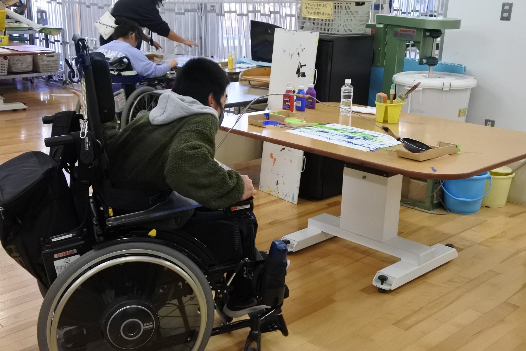 そして行き着いたのは、「全員が車椅子に乗りながら制作を行う」というもの。絵の具を自由に混色して色を作り、車椅子に取り付けた描画道具(筆や刷毛、ローラーやスポンジなど)を扱いながら画用紙を塗っていくという内容です。