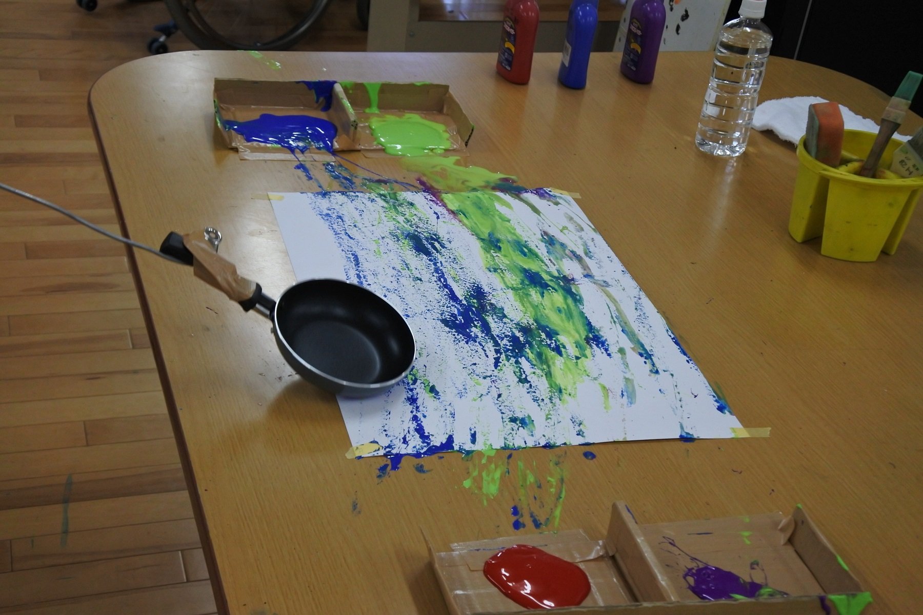思い通りにはいかない動作を繰り返すことで表れる色の軌跡が、ダイナミックなものもあれば、繊細なものもあり、個性豊かな作品がたくさん生まれました。想定外の線や形にも好奇心を持ち、次々と新しい表現に挑戦していると、あっという間に時間が過ぎていきます。制作時間ギリギリまで高い集中力を維持しながら、取り組むことができました。