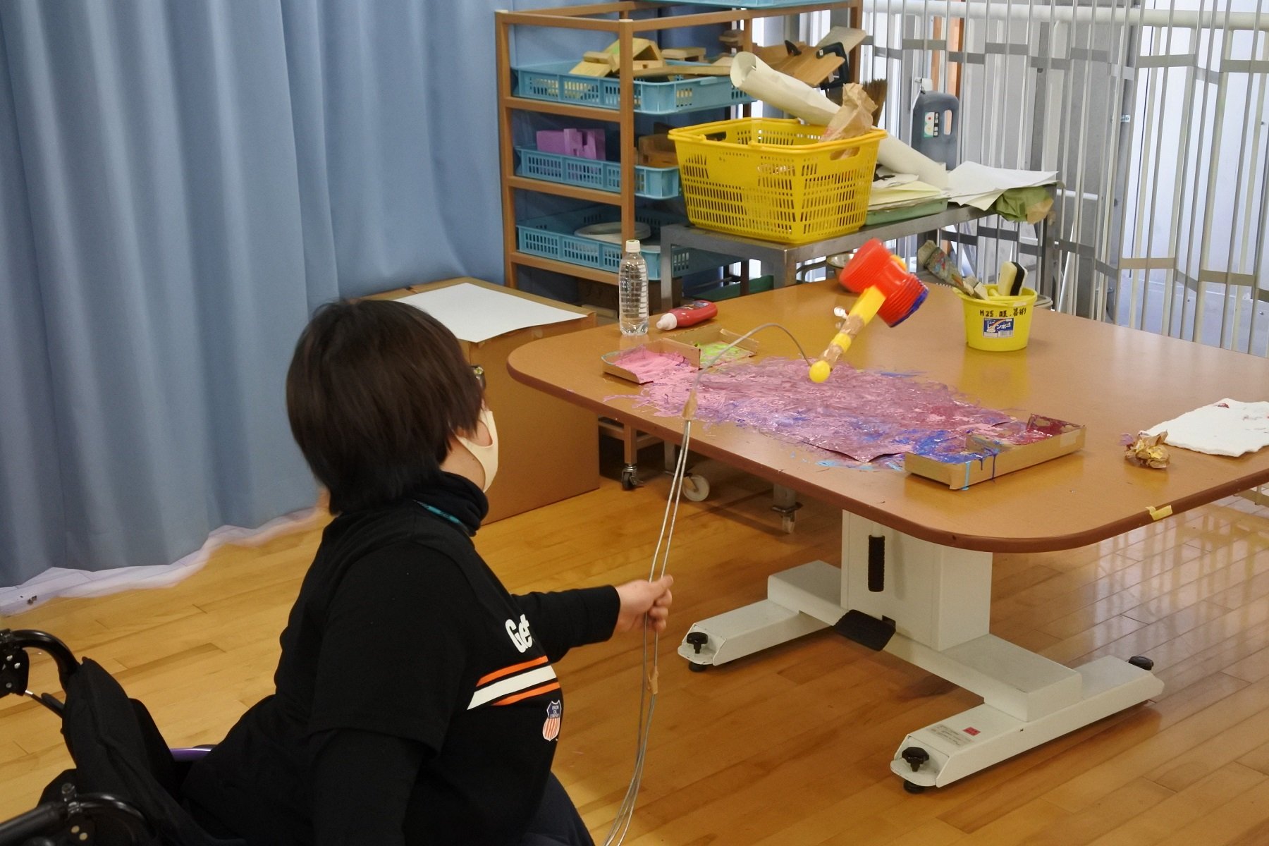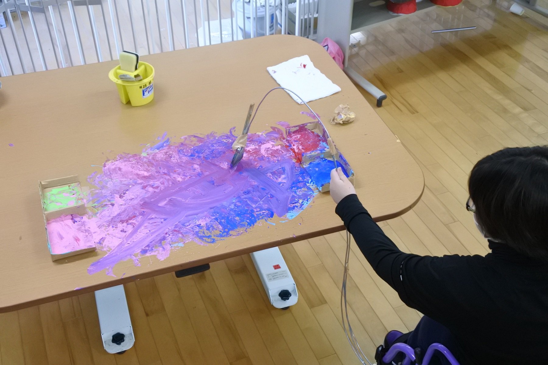 既成概念にとらわれず画用紙を「かっこよく塗る」というのは、ここまでの実施校との共通事項です。しかし、今回授業を行ったのは肢体不自由部門のため、制作可能な内容も、生徒一人一人によって違いがありました。その違いに配慮しながらも、全員が同じ題材に取り組むためにはどうしたら良いのか、先生と入念な打ち合わせを行った上で当日を迎えました。