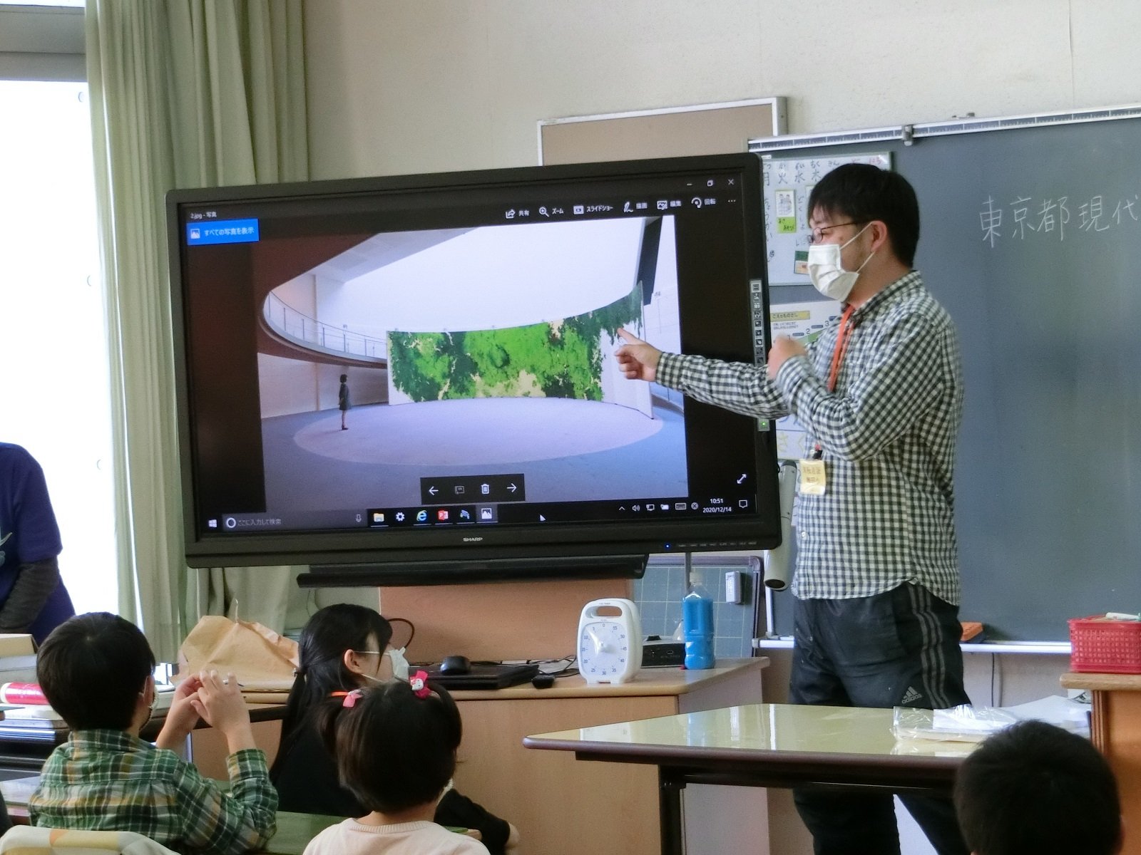 あらかじめ作品を設置していた別室に足を踏み入れた瞬間、児童たちからは「わぁ!」と歓声が上がりました。普段、学校では滅多に目にすることのない大きさの作品に、圧倒されている姿も見られました。