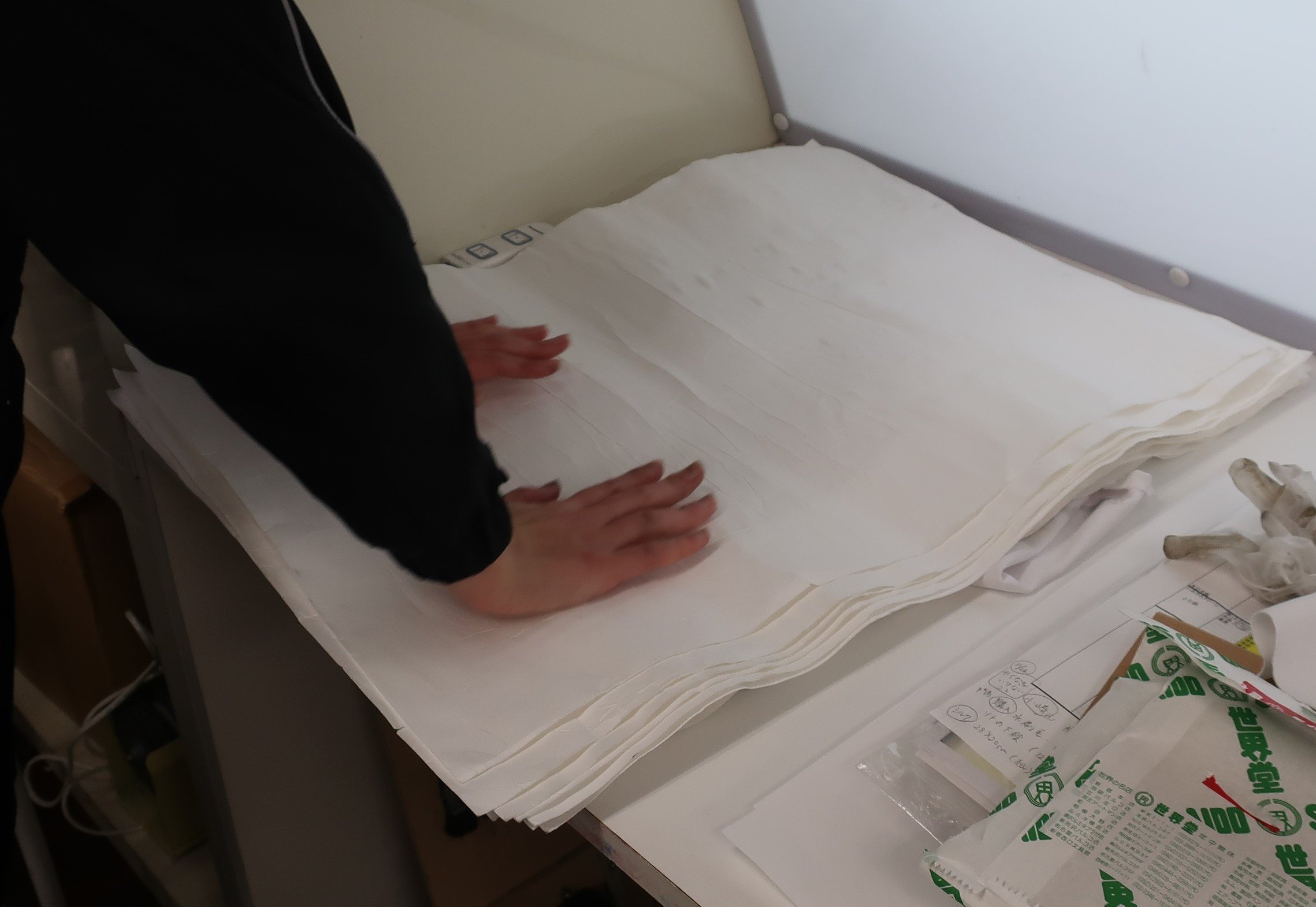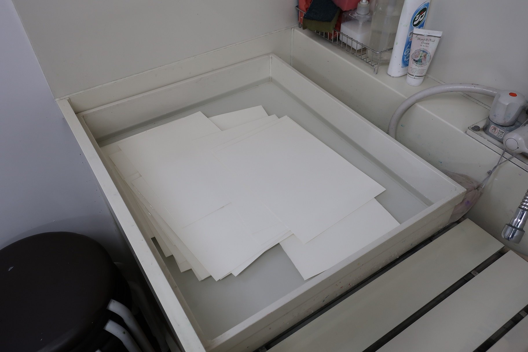 インクの定着を良くするため、紙は事前に水に浸しておきます。刷る前に余分な水気を取ったら準備完了。
