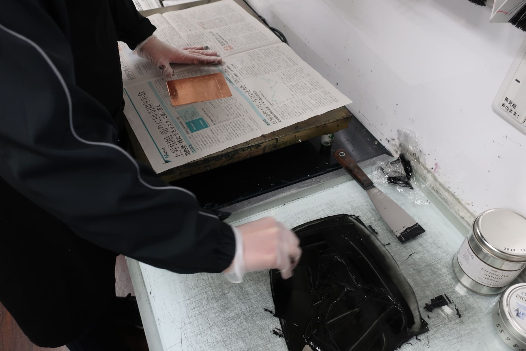 版面に施されたくぼみに入っているインクがプレス機を通り圧力が加わることで、紙に写し取られます。