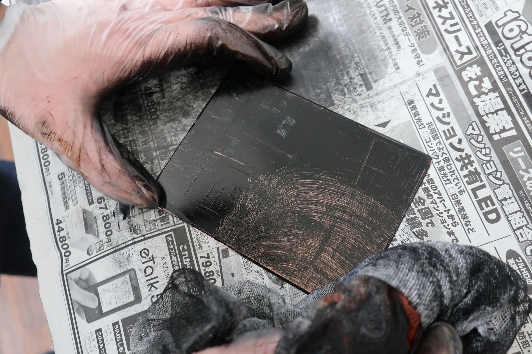 版にインクがつまったら、目の粗い布から、きめの細かい布へと持ち替えて、凹部以外のインクをふき取ります。