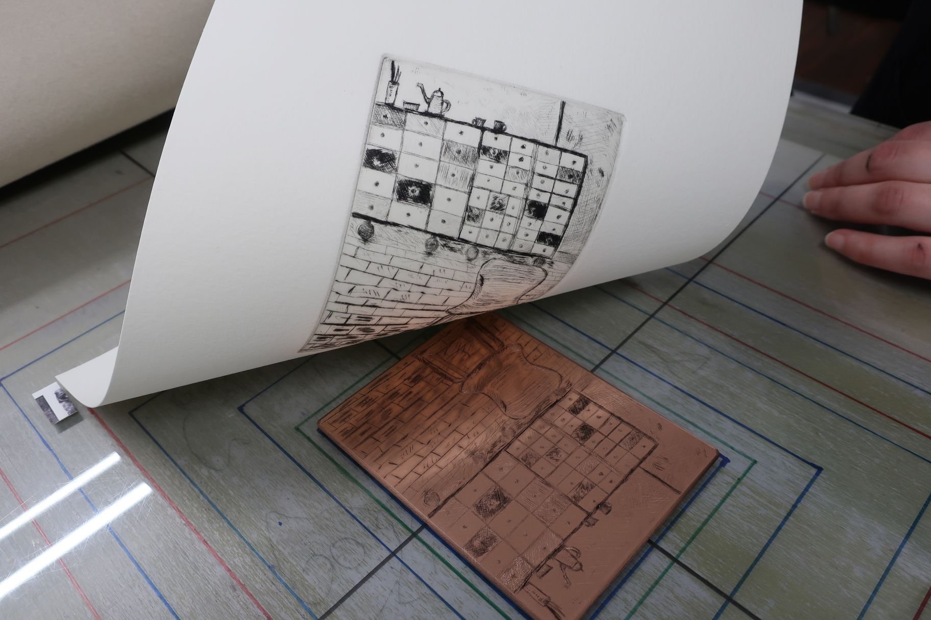 例えば、銅版画のドライポイントという技法では、先のとがった道具を使って銅板を彫り、版面にできた凹部(くぼみ)にインクをつめて、刷り取ります。