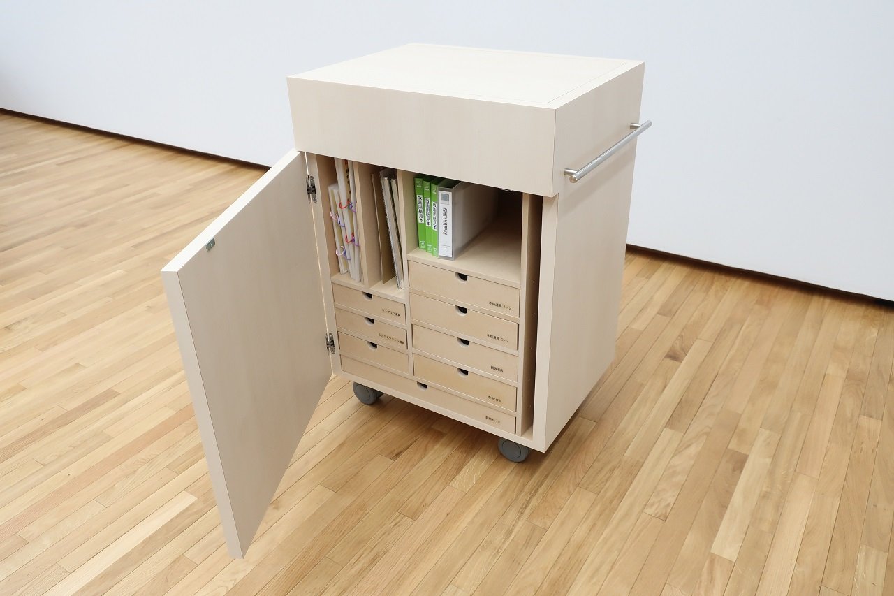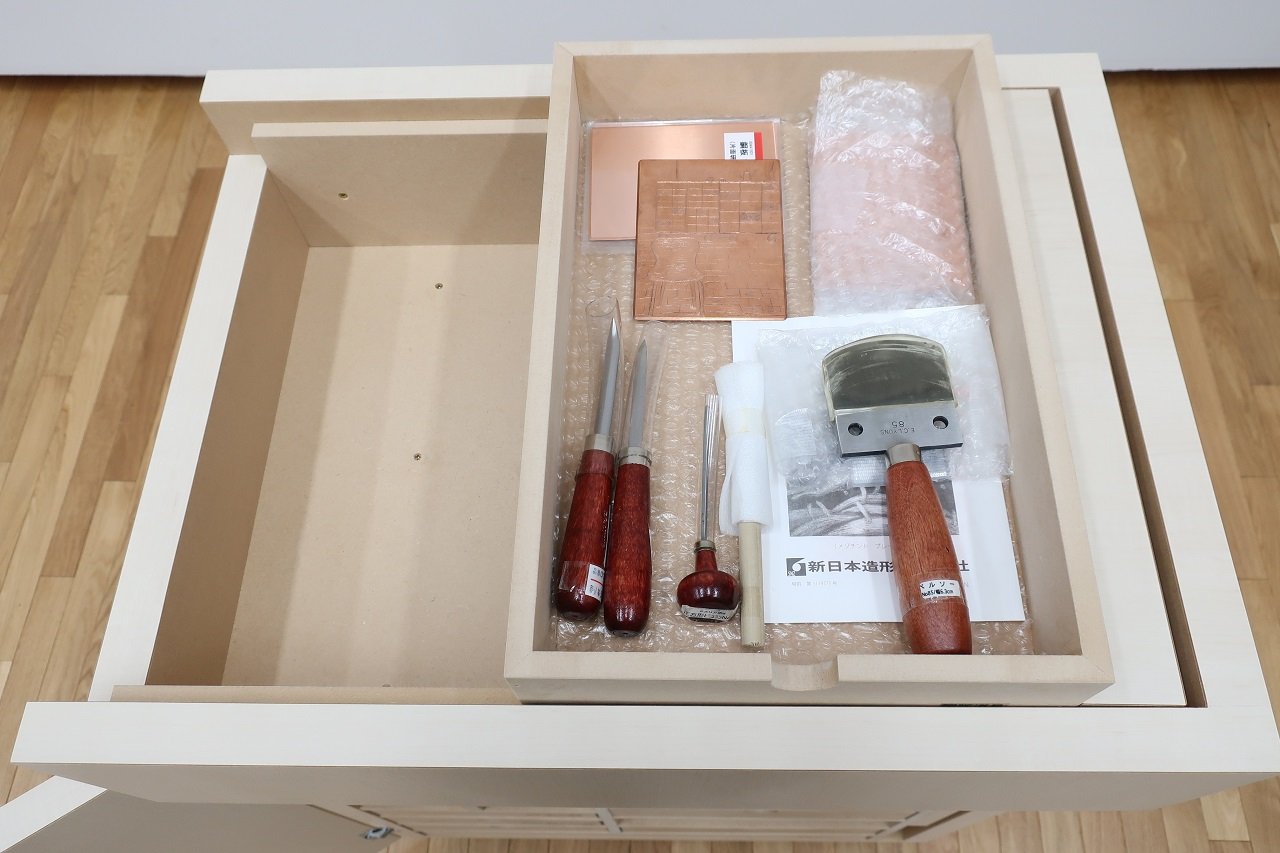 上右写真の引き出しには、版面を直接削ったりするために使うニードルやビュラン、それらの道具を使って実際に図柄を施した版などが入っています。手に持って重さを確かめたり、道具ごとの持ち方を試してみたり、版面に刻まれた線を触ったりすることができます。