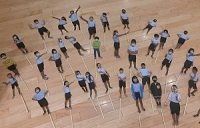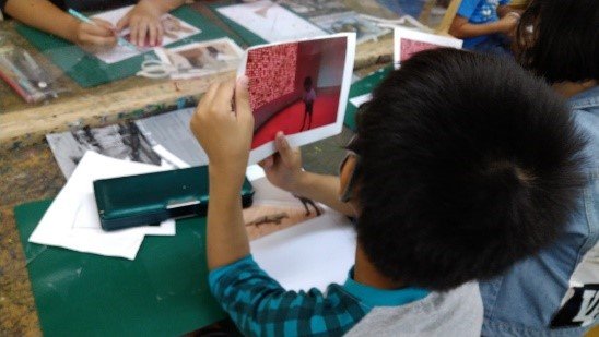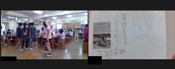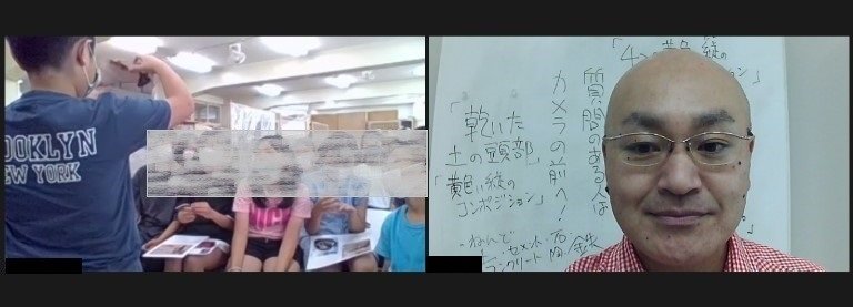 リモート授業では、図工室全体を俯瞰して映し出し、こどもたちにはカメラ前に集合してもらいました。ただし、感染防止のため発言者以外は話さないというルールをとり、話す時はカメラの前に出てきてもらいました。