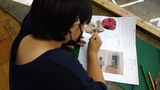 「分身」による作品鑑賞の様子を紹介した後は、自分の鑑賞写真を用いて実際に展覧会に行ったつもりになって想像しながら鑑賞日記を作成してもらいました。フォーマットは図工担当教員のアイデアで絵日記形式、写真を切り張りし吹き出しなどを付けるコラージュ形式、自由形式の3パターンの作成方法が用意。展覧会チラシも事前に学校に送付し活用してもらいました。