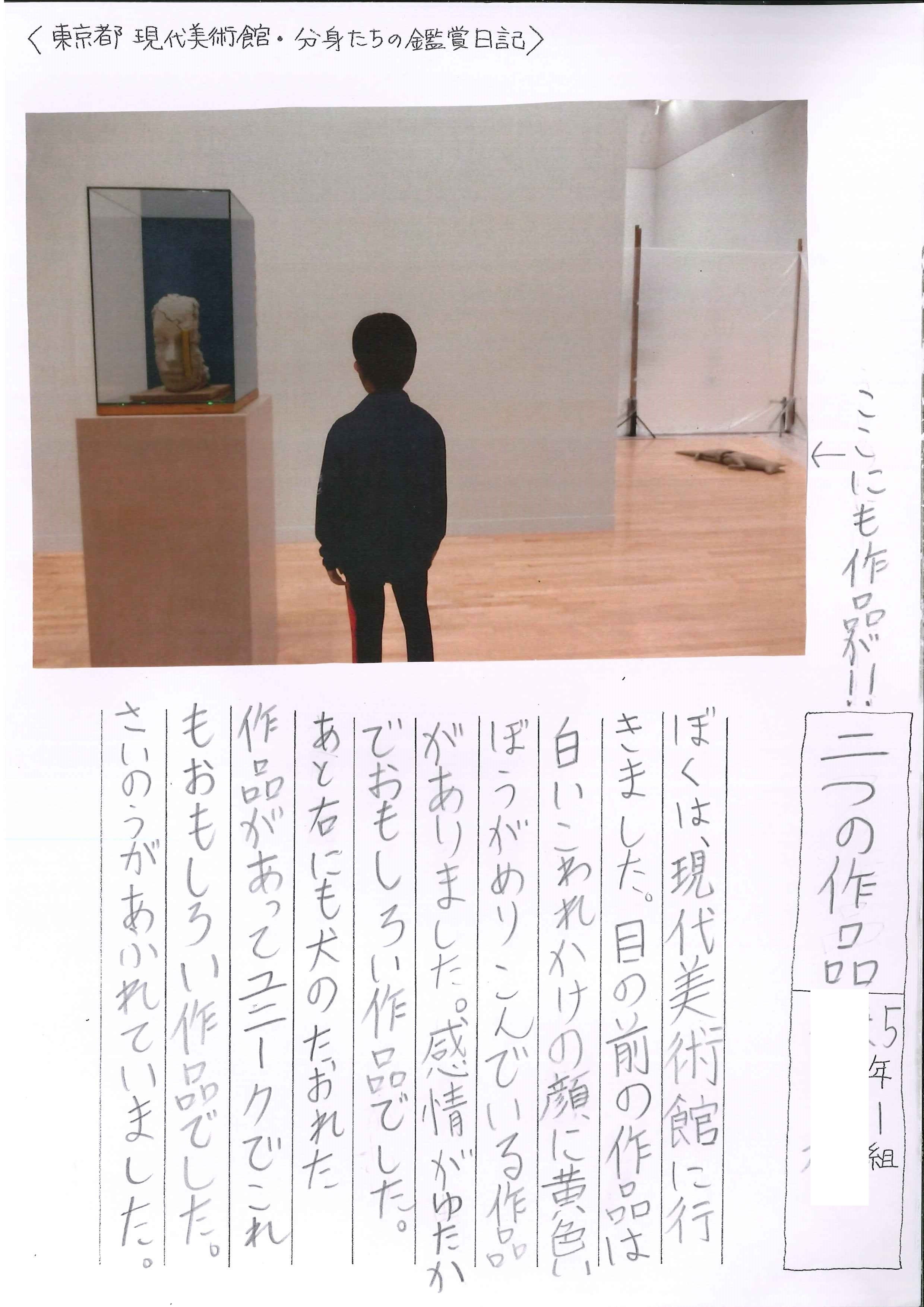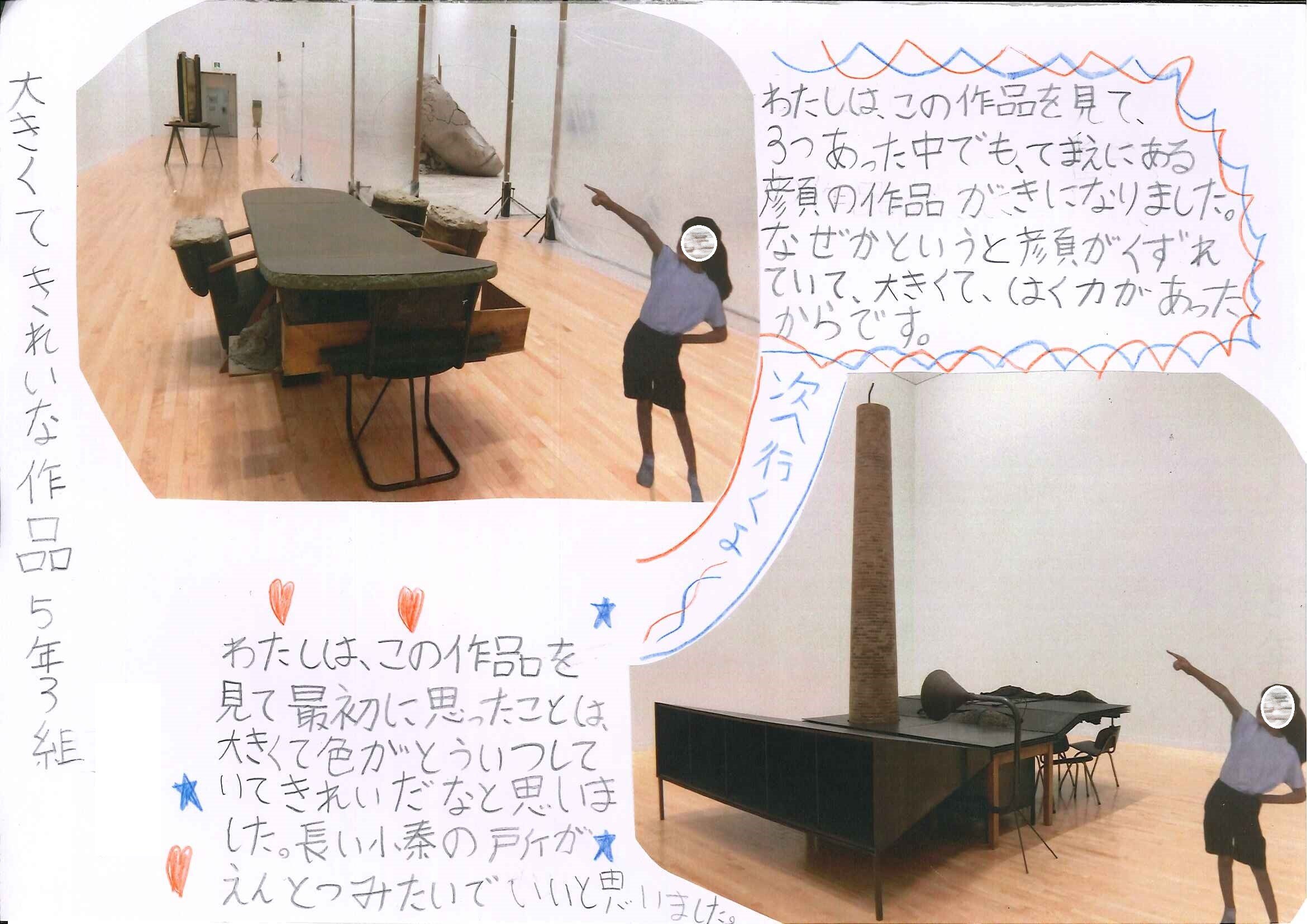 「リモートの良し悪し(画面越しのため自分ごととしての意識が低かったような気がする)はあるが、外部とつながり連携していくことが、こどもたちにとっても教員にとっても、有意義な活動だった。事前に学芸員と対面したり、美術館の情報を得たりしたことで、日記の表現は昨年よりも広がりがでた」