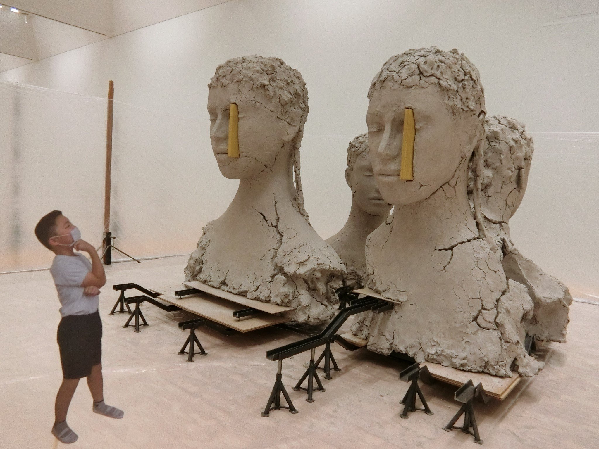 こどもたちの「分身」が美術館に送られてきた後、「分身」を展示室内に連れ出して、作品を鑑賞しているかのように撮影して写真データを学校へ送付しました。