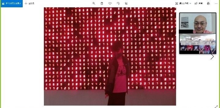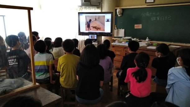 授業2回目もリモートによる授業です。「分身」が作品鑑賞をしている写真データを画面共有でモニターに映し出して紹介。こどもたちからは、「すごい!」「居るみたい!」など思い思いの感想が出てきました。