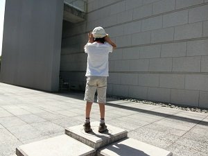 事前学習が効果的にはたらき、こどもたちは美術館でのルールをきちんと守りながら、屋外にある体験型の作品を見つけると積極的に体験していました。例えば、上に乗り周囲の音に意識を集中させる鈴木昭男の作品《点 音》では、「鳥の鳴き声がする」「車の音も聞こえた」など、音に集中し作品を楽しんでいる姿がありました。