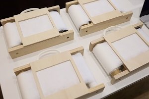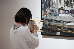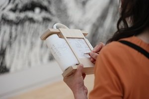 さて、ゲストのレクチャーの後は、土谷氏考案のジャーナル・ユニットなるメモ用ツールを持って各自展示室に出向いて作品鑑賞タイム。このツールは巻物状になった和紙製のメモ用紙が装着されているボックスで、クルクルと紙を指で回しながら進めたり、巻き戻したりしながら自分の思考をメモをしていきます。