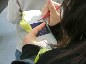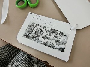 事前授業として教育普及担当の学芸員が、学校に出張し美術館やコレクション作品の概要をレクチャーした後、チラシを用いたオリジナル鑑賞カードの作り方を指導しました。チラシに使用されている作品画像などを切り抜いて、6ページ程のカード状のメモ帳を作ります。はじめは作り方にとまどっていたこどもたちも最後はメモしやすいように罫線を書き込んだり、チラシの文字の部分を切りぬいてコラージュしたりとマイ鑑賞カードへと変貌させていました。