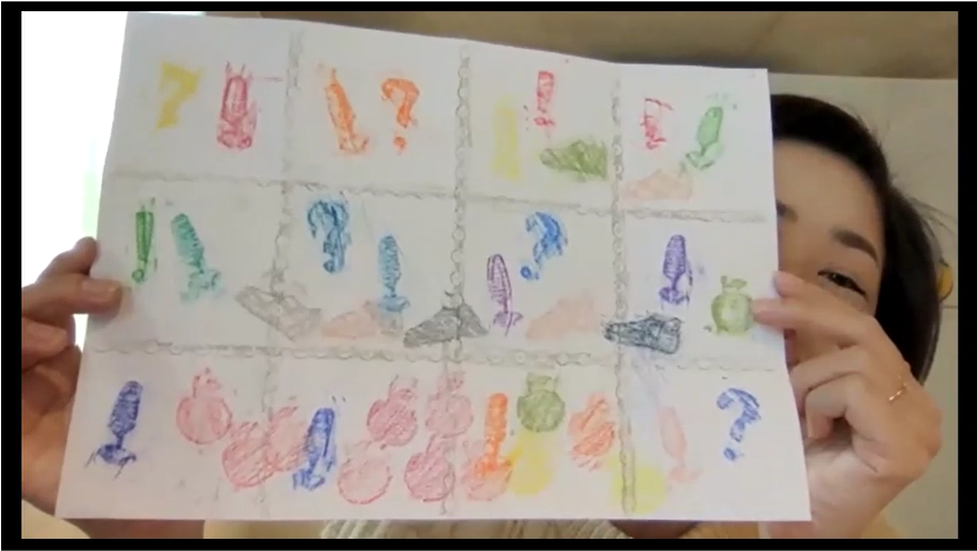 続けて、事前送付した素材(スパンコールやバッグクロージャー、クリップなど)やルーズリーフの穴を活用したフロッタージュの実演を含めながら、画用紙からつくる紙版の制作手順の説明に移ります。