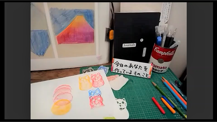制作時間を終えたら、参加者の作品を一人ずつ紹介し、全員で鑑賞します。日頃のルーティーンを表現したものや、居住地周辺の風景を表したもの、仕事や趣味の要素を表したものなど、参加者各々が咀嚼した制作テーマが表現されていました。