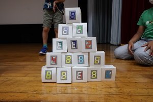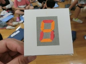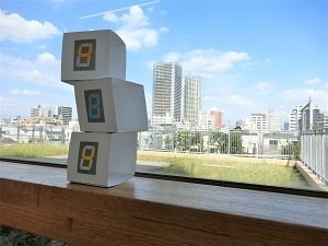 出張授業では、本作品の展示風景や作品画像、実際に作品で使用されているものと同じガジェット(デジタルカウンターのパーツ)などを用いながら、作品の意図などの説明も交えて、鑑賞活動を行いました。そして作品鑑賞後は、本作品に関連した表現活動を実施しました。表現活動ではオリジナルの立体ワークシートを活用し、自分の好きな数字や自分を表す数字を考えてワークシートに数字を描き、併せて理由も記してもらいました。さらにワークシートを組み立て体育館や教室、図工室など各学校の状況にあわせて展示活動も行い、みんなで鑑賞しました。