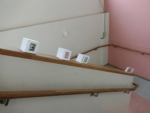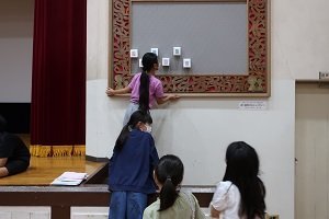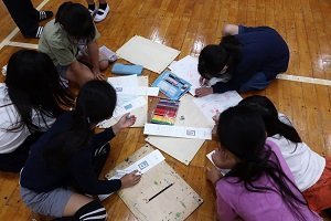 品川区立品川小学校は、来館して実際にコレクション展示室で宮島さんの作品を鑑賞しています。ですので、この授業は事後学習という位置づけで実施し、さらに鑑賞体験を深めることができました。展示活動は階段の踊り場や廊下で行いました。休み時間に他学年のこどもたちにも見てもらいました。