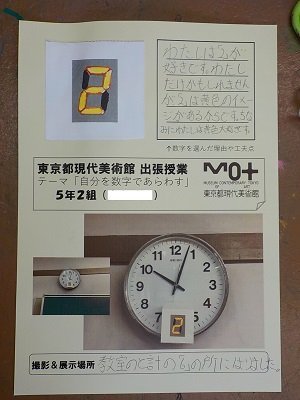 葛飾区立こすげ小学校では、図工室を使って活動しました。展示も図工室や廊下、自分達の教室を使って展開。展示したままにはできないので、展示後タブレットで撮影し写真で記録して残しました。さらに、撮影した展示風景写真やその数字を選んだ理由などをまとめたシートも作成し、廊下に掲示して他学年のこどもたちにも活動の様子を伝えました。