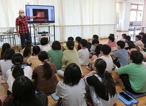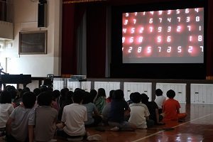 港区立笄小学校では、体育館に集まってスクリーンに作品画像や展示風景の動画を投影して鑑賞し、実際の作品に使用されているガジェットも紹介しました。鑑賞後は、ワークシートに取り組み体育館に自分達の数字を展示しました。体育館一杯に数字が広がりました。