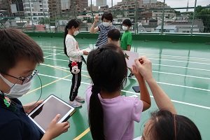 カードとタブレットを持って屋上に上がり、穴から空を覗いたり、お互いに協力し合いながらタブレットで撮影を行いました。あいにくの曇り空でしたが、穴から見える空の形はそれぞれに異なり見る場所も変えながらにぎやかに撮影が進みました。