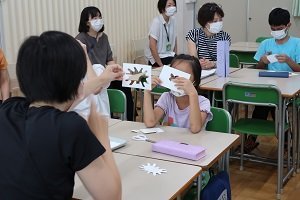 教員からは、この授業は言葉だけでは十分に理解できないこどもでも活動ができ、穴の形を学芸員にほめてもらえたことが、そのこどもの自己肯定感を強めることにつながったのではないかとコメントをいただきました。さらに、いつもの授業では消極的なこどもが、かなり複雑な穴の形を切り抜く事に集中して挑戦していたことが印象的だったようで、そのこどもの新たな側面に気が付くことができたともおっしゃっていました。今後の授業でも時間帯を変えながら今回作ったカードを用いて空を見て撮影する活動を継続したいと嬉しい言葉も頂戴しました。