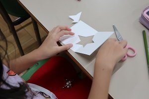 続いて、普段とは違った空の見方として「穴から空を見てみよう」と提案。ハガキ大のカードにいろいろな形の穴を空けて、その穴から空を覗いてみることを説明しました。日本語の習得がままならないため、日本語学級教員からの事前のアドバイスを参考に主にイメージ図や実演をまじえて理解を導きました。とはいえ、こどもたちの反応が今一つつかめずにいましたが、実際にハサミを使ってカードに穴を開ける作業になってからは、どのこどもたちも楽しそうに「星」や「ハート」などいろいろな形を切り抜くことにチャレンジしており、笑顔も見られるようになりました。自分の国(ネパール)の国旗の形(三角形を上下に2つ連ねたような形)に切り抜くこどももいました。