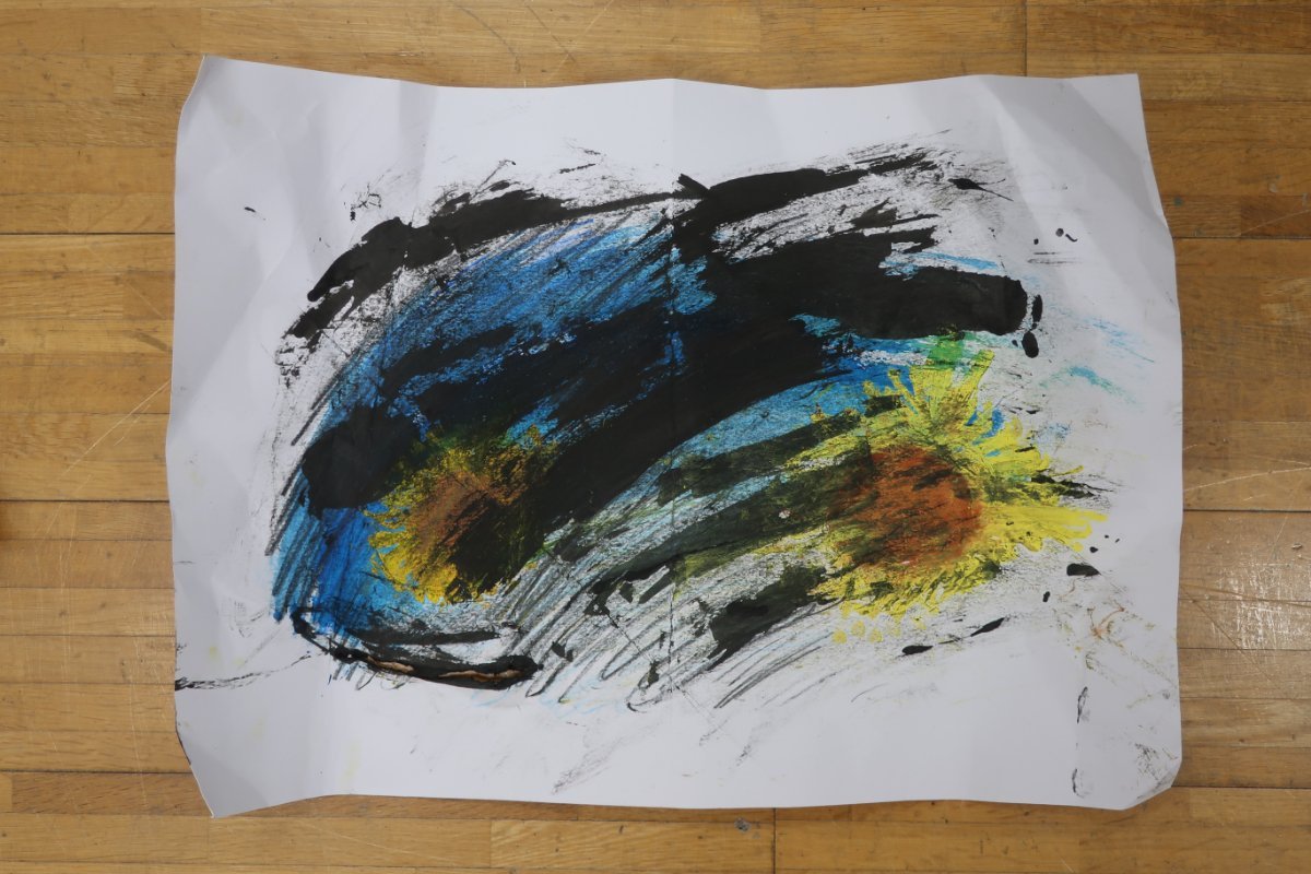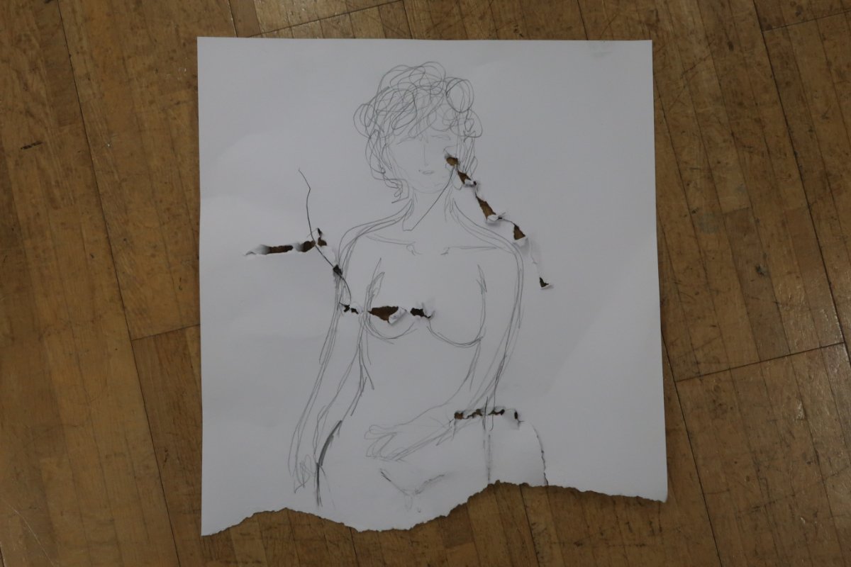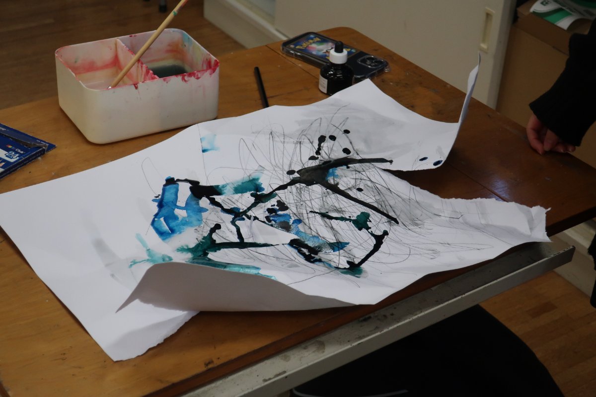 紙をクシャっとさせてから描いたり、バラバラにちぎった紙をつなぎ合わせて描いたり、描き始める前の紙にも加工を施す人も。普段の授業では使わないような描画材も使いながら、“下手な絵”を描き進めていきます。