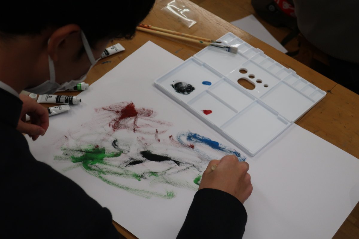 学校訪問当日は、最初に、潘さんからご自身の作品紹介や制作に向けて考えていることなどの紹介がありました。その後、いよいよ今日の授業で取り組むことの説明です。「画用紙などを支持体に、絵具やカラーインク、クレヨンや色鉛筆などを使って“下手な絵”を描いてください。でも、支持体は紙にこだわらなくても良いです」という潘さんのお話を受けて制作スタート。